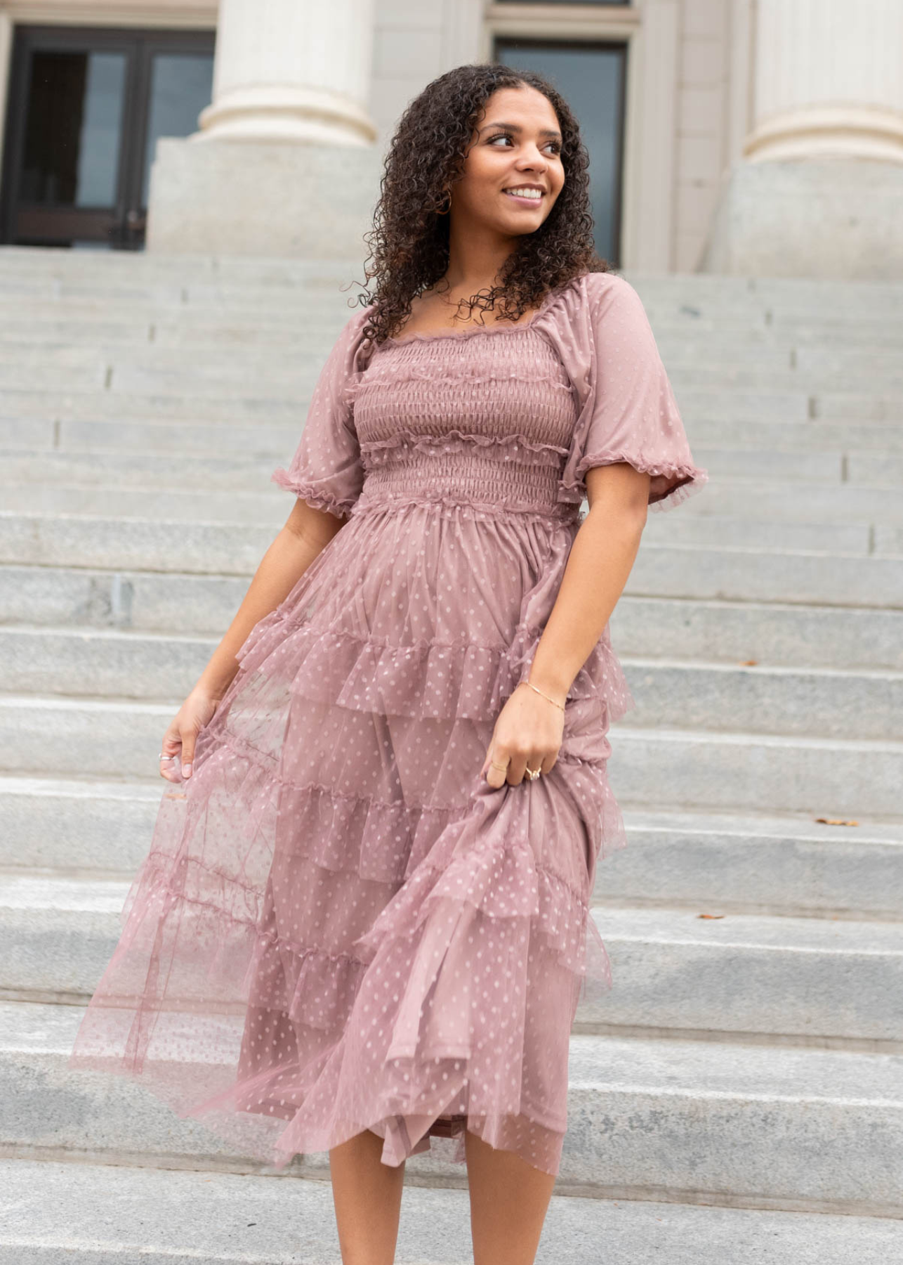 Short sleeve dusty rose dress with tulle ruffles on the skirt