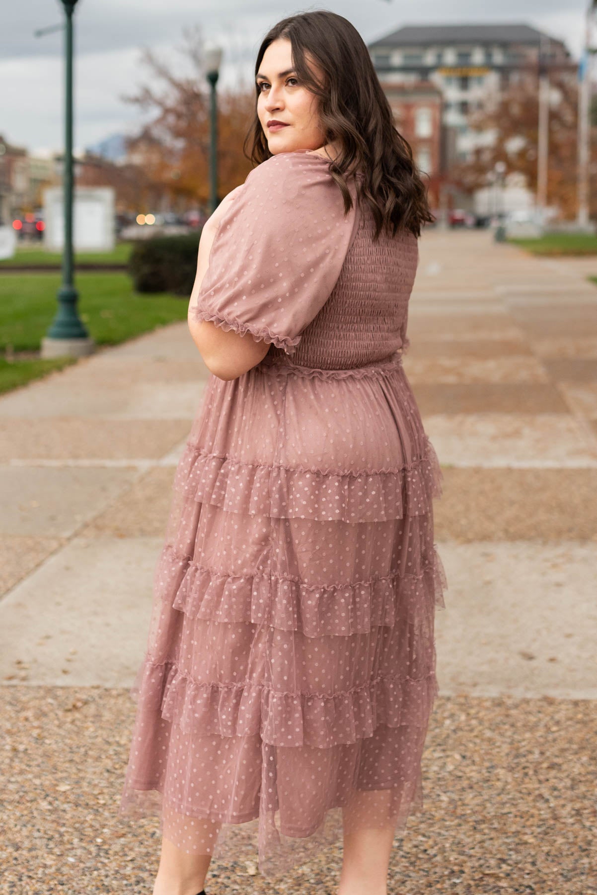Side view of the plus size dusty rose dress with dot on the tulle.