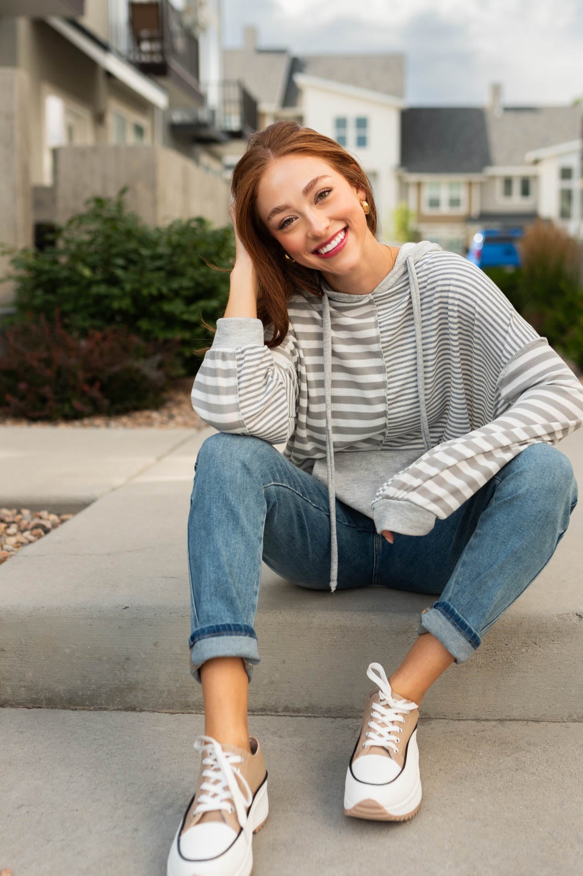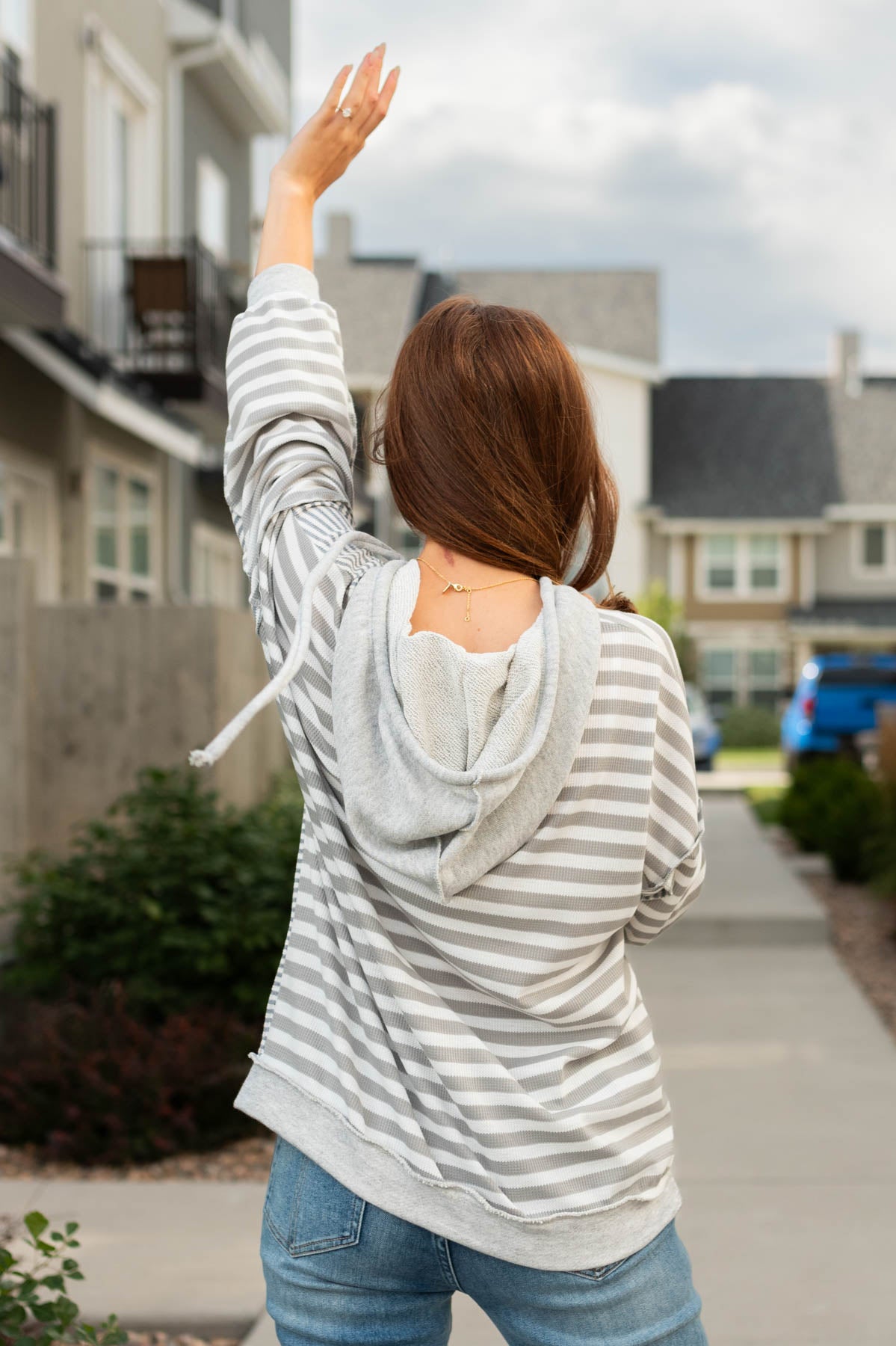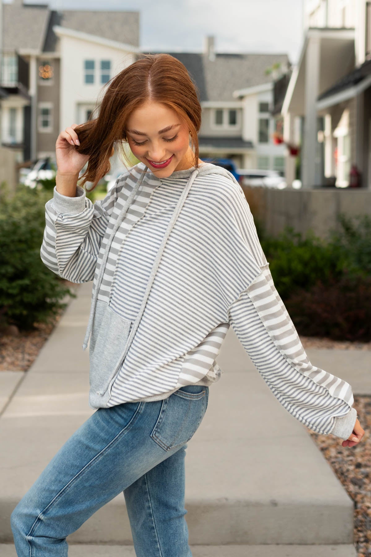 Heather grey hoodie with long sleeves, stirpes and front pocket