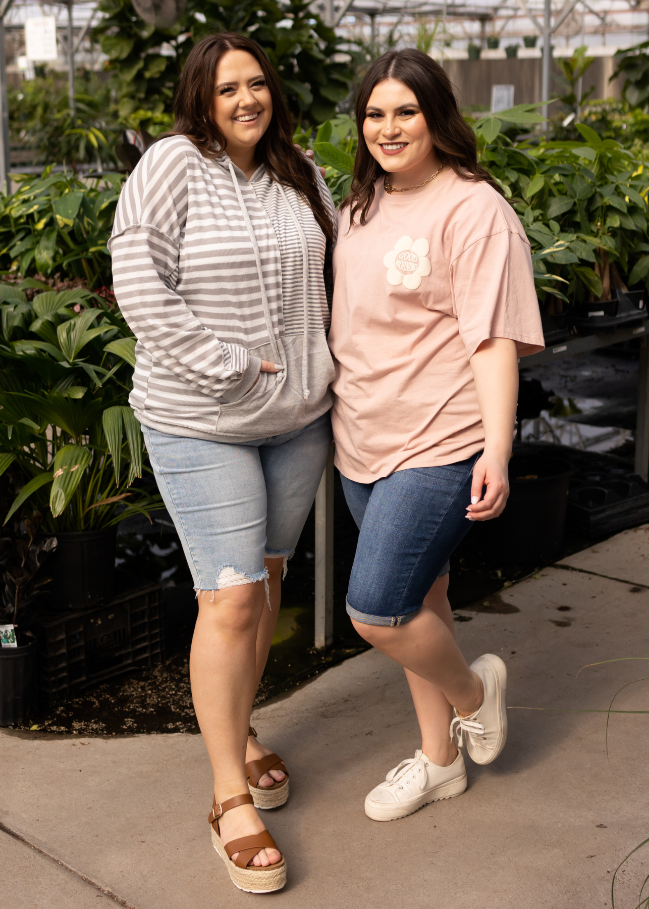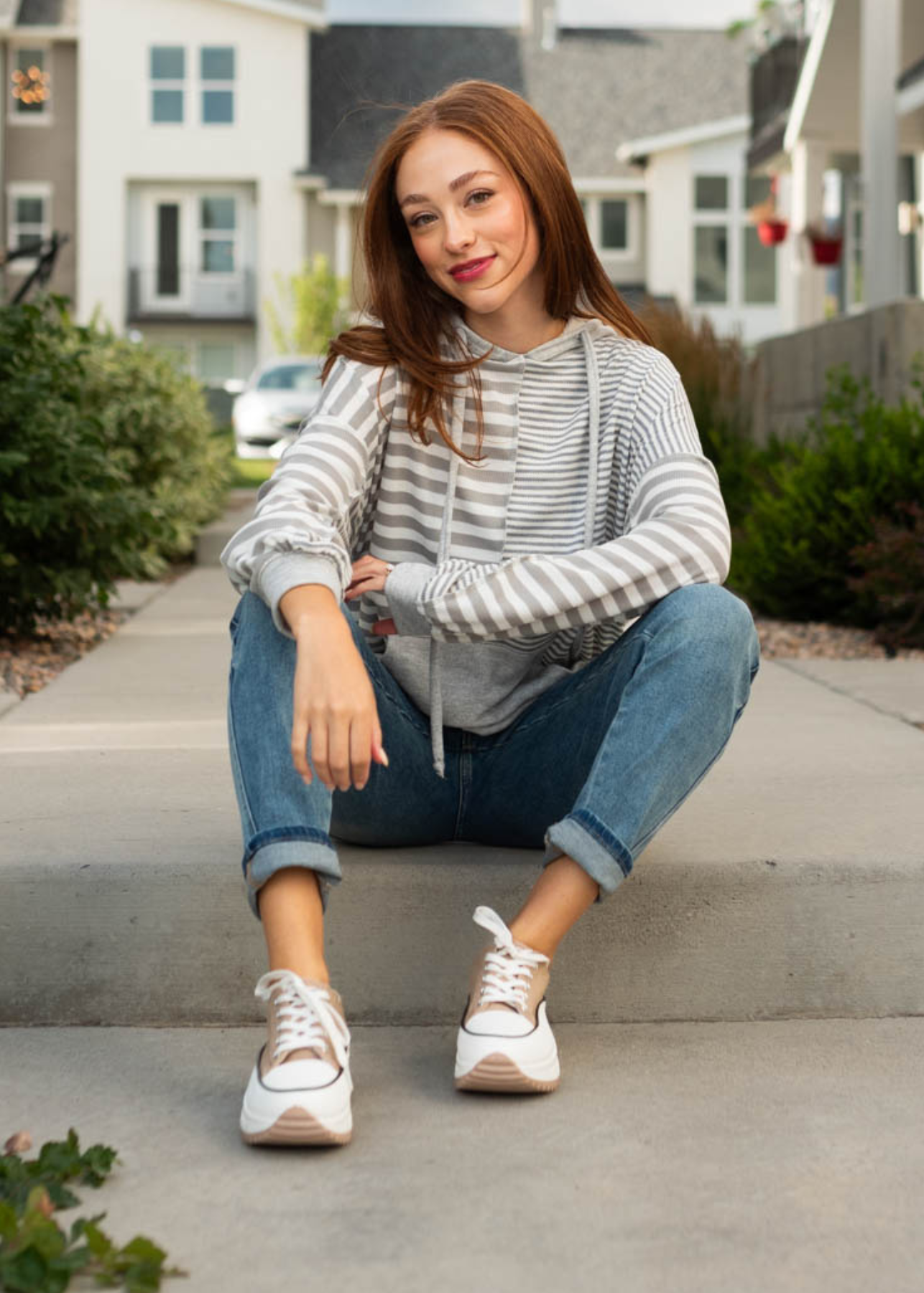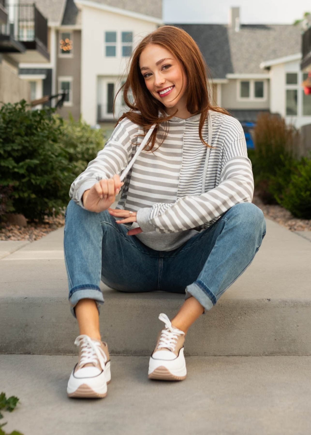 Heather grey hoodie with long sleeves, stirpes and front pocket