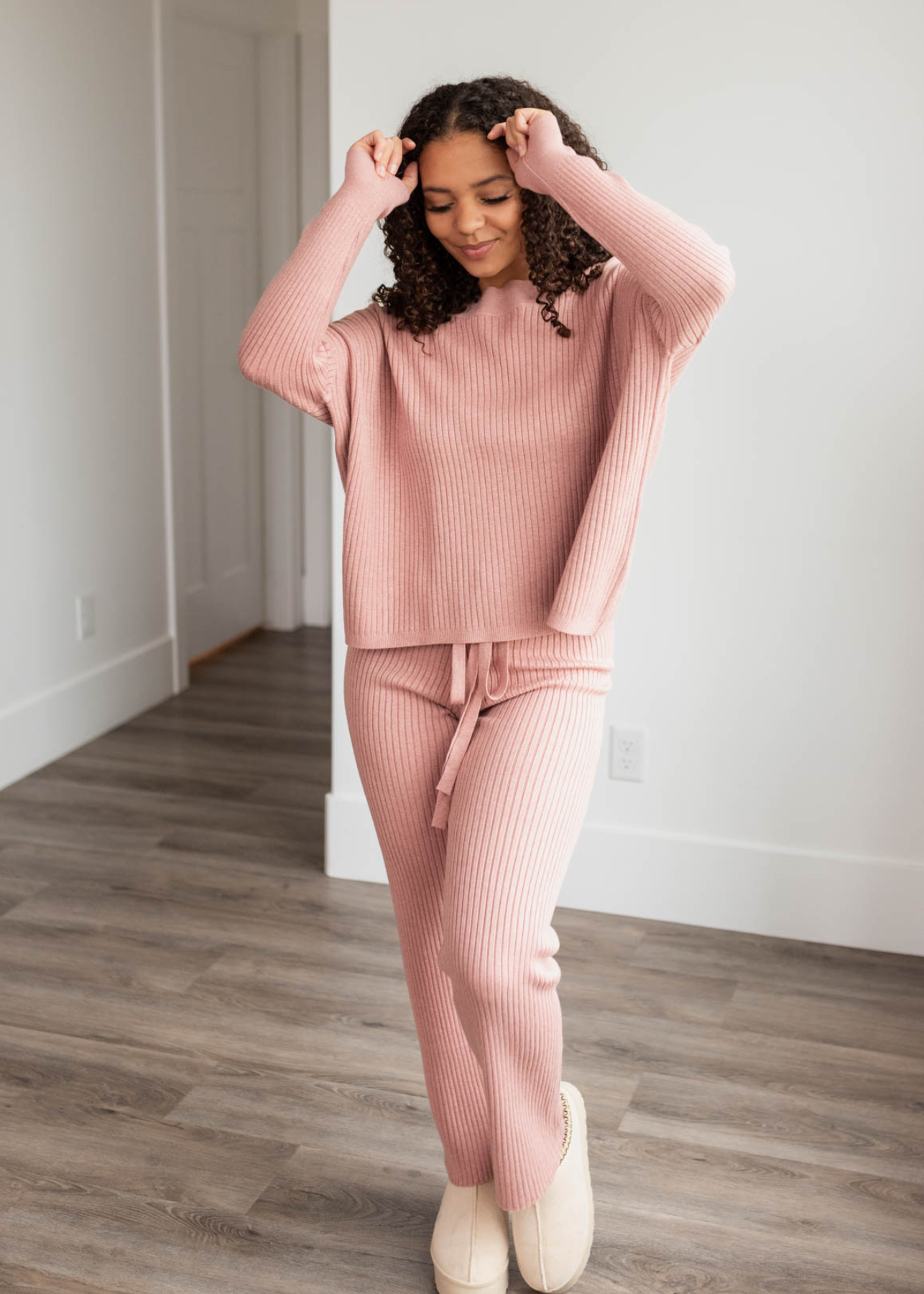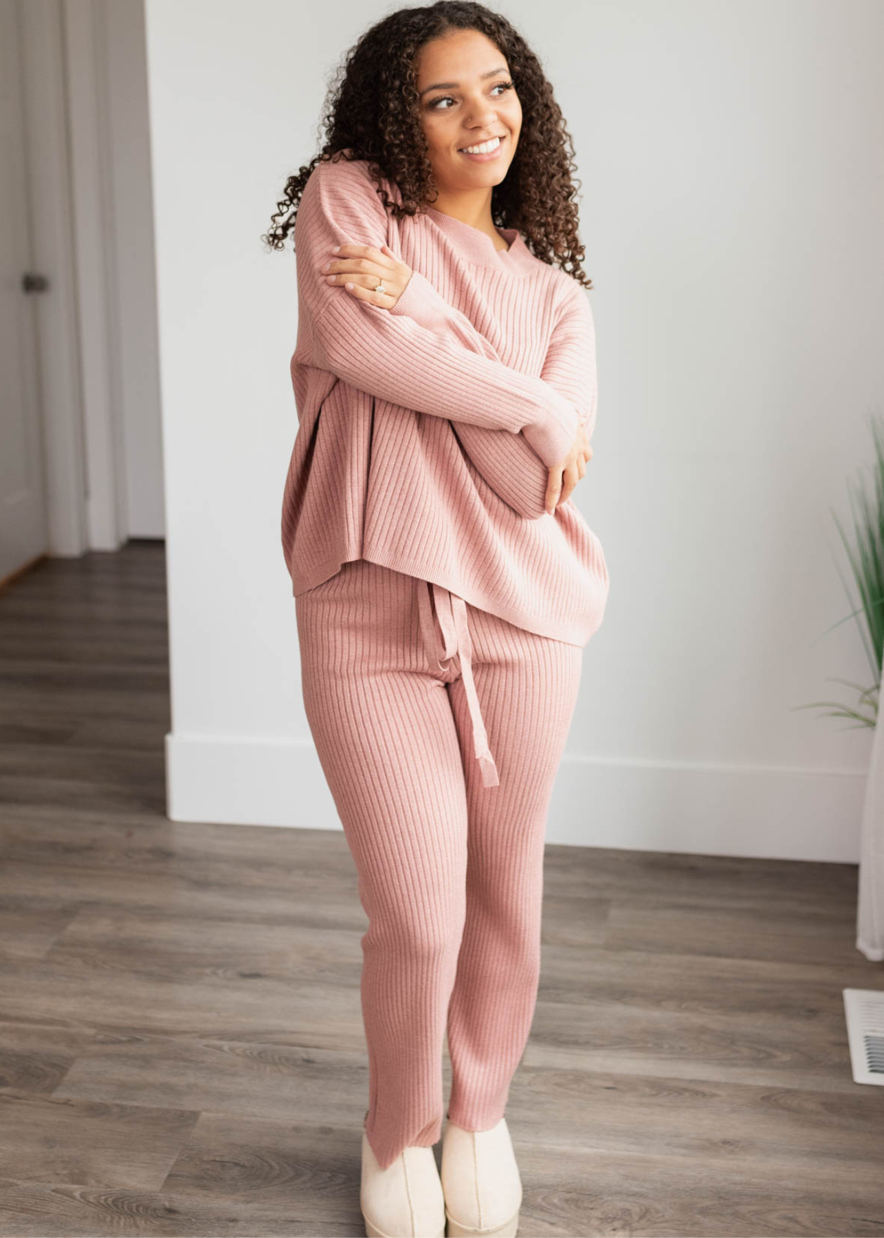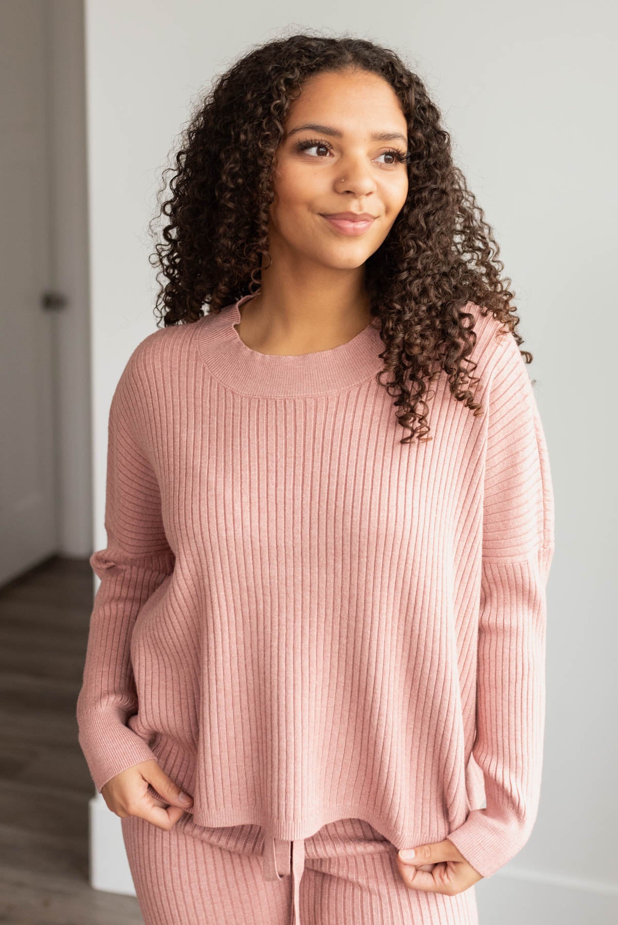 Side view of the blush sweater