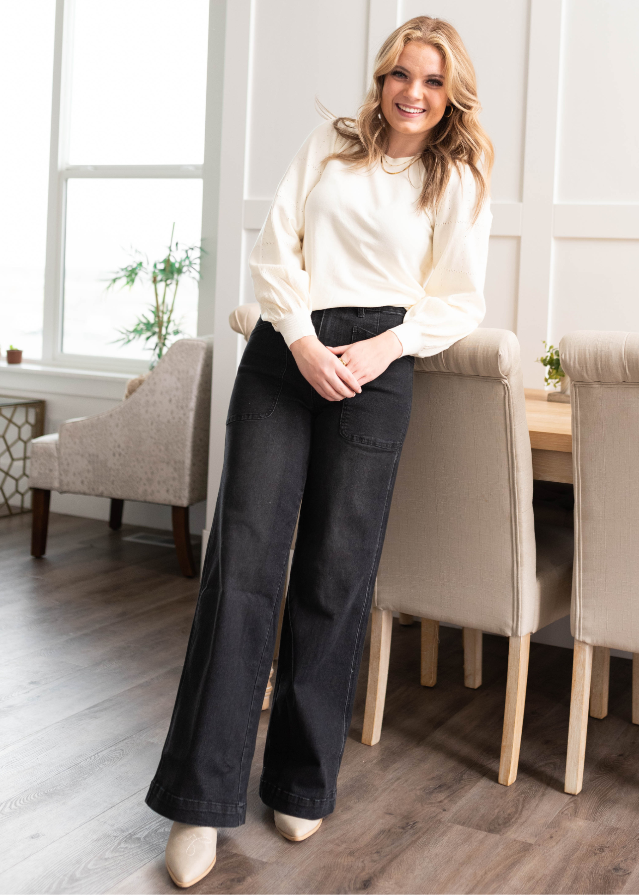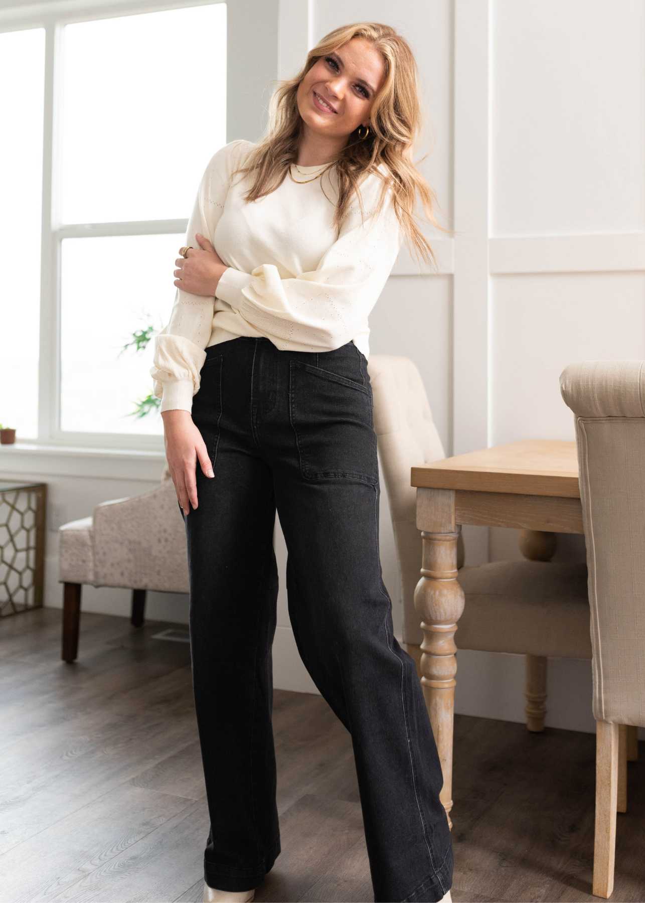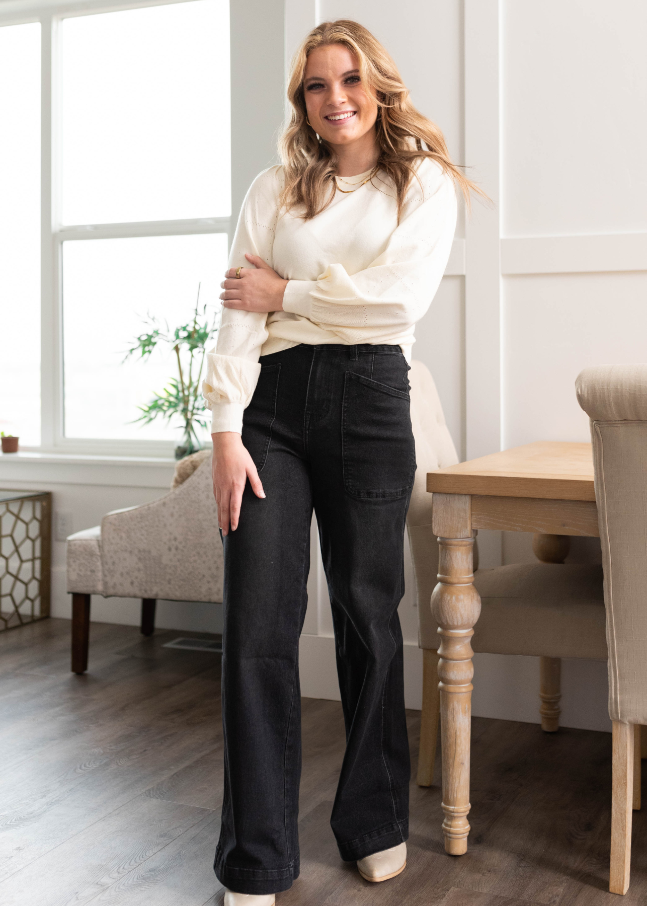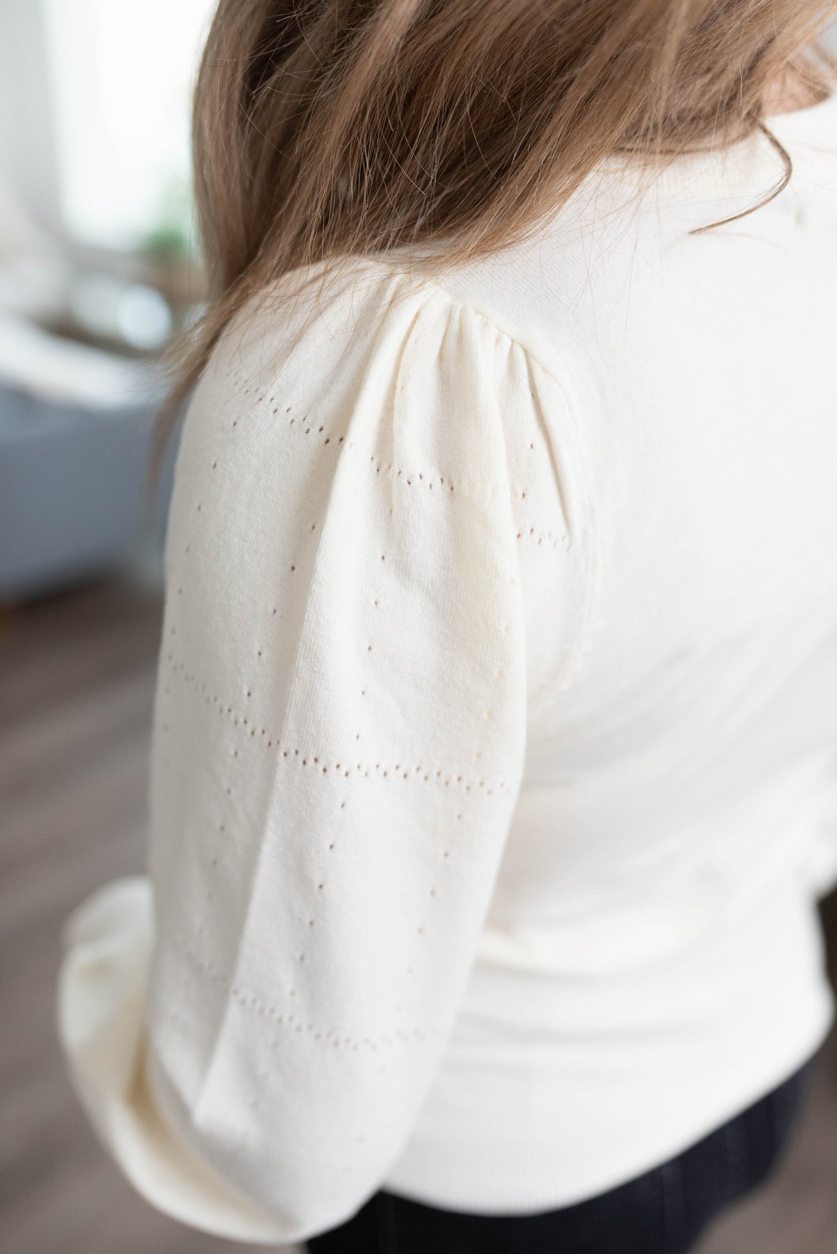 - Flattering textured puff sleeves