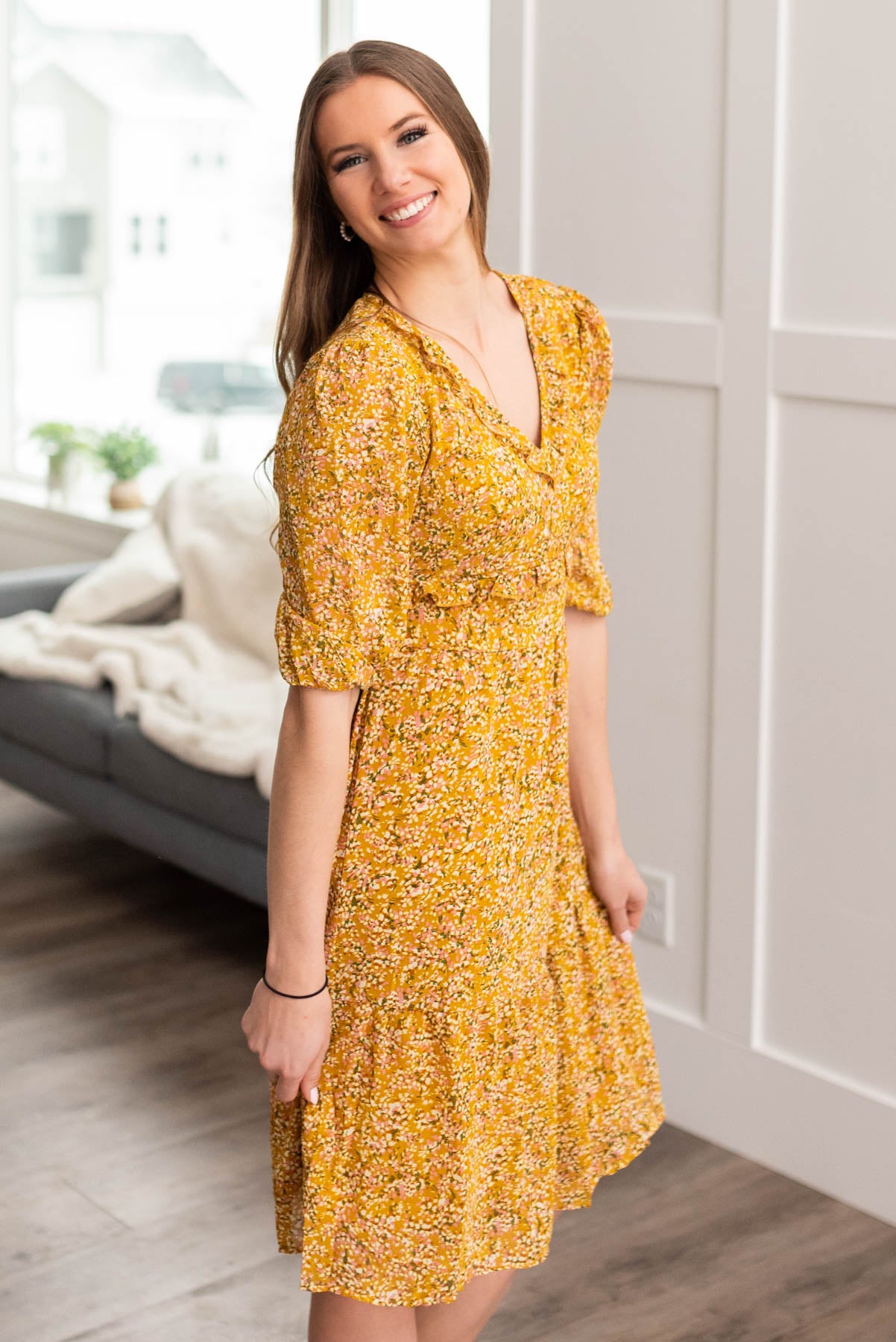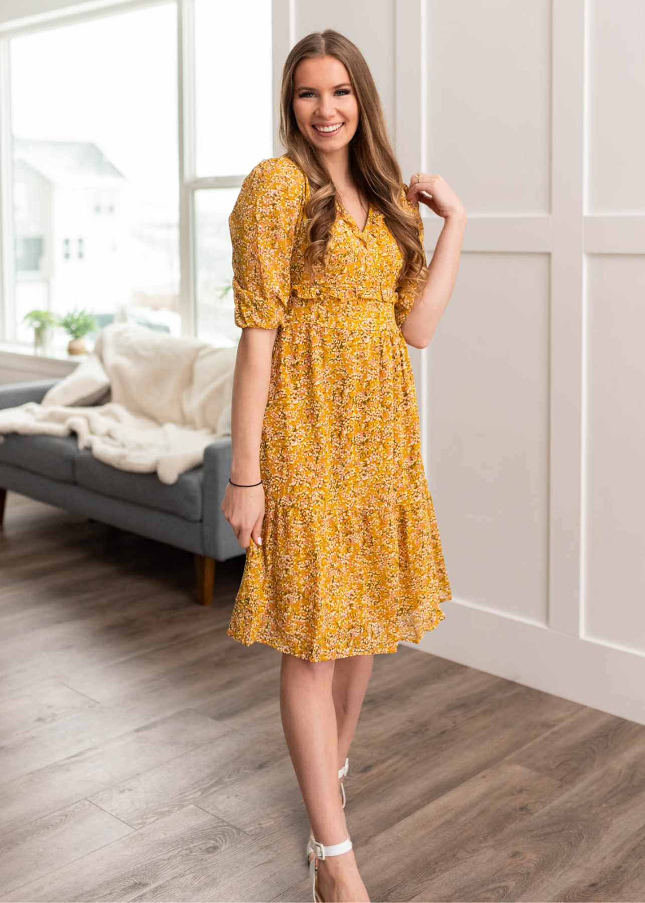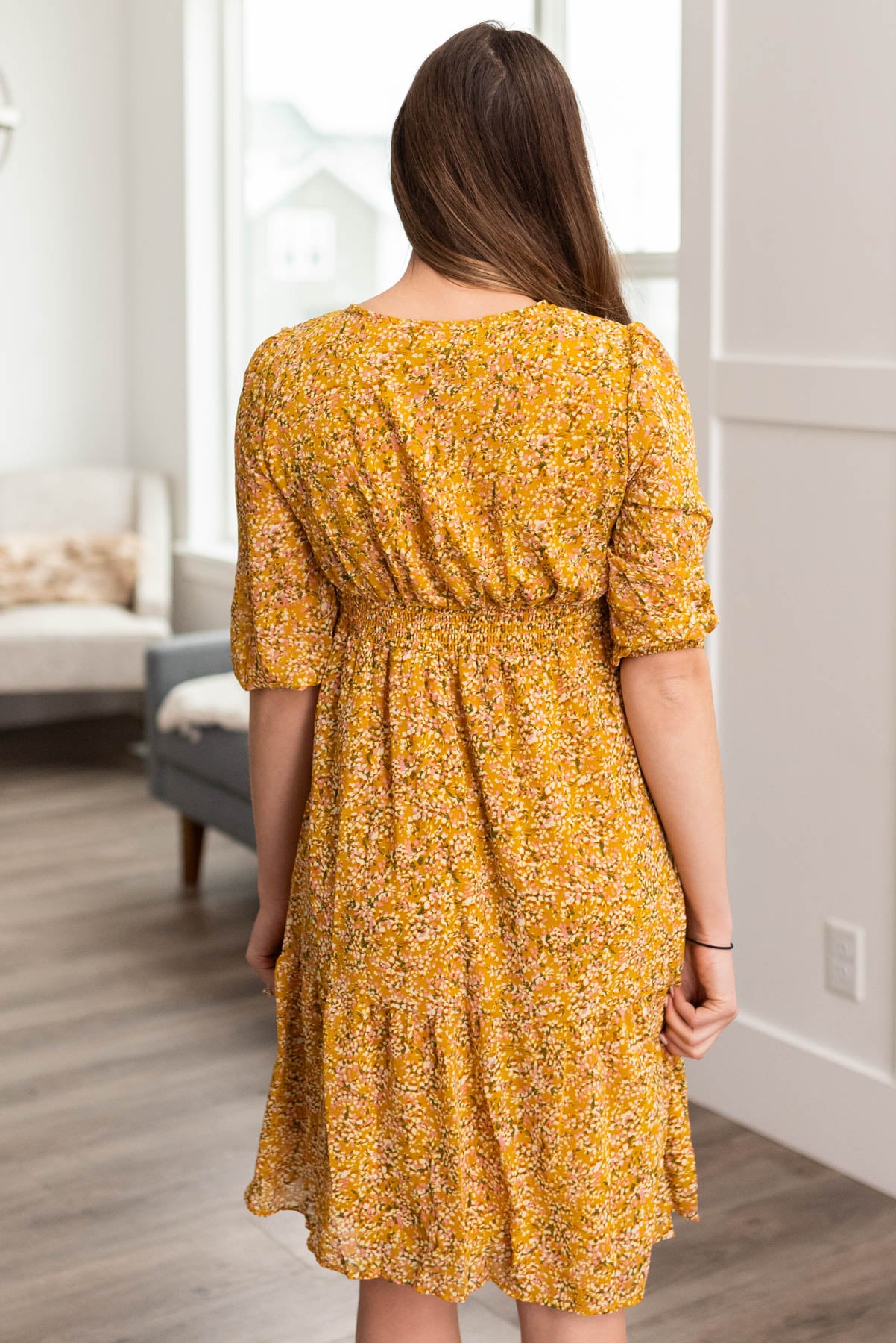Short sleeve mustard floral dress with smocked bodice and v-neck