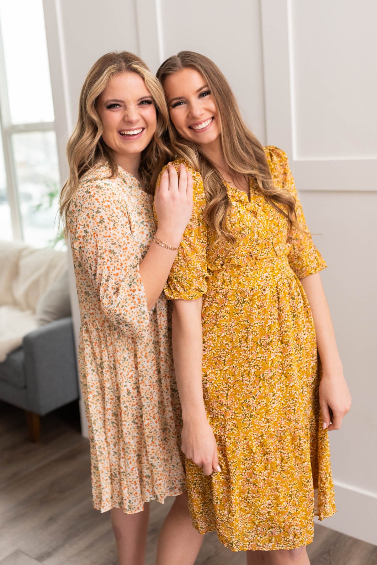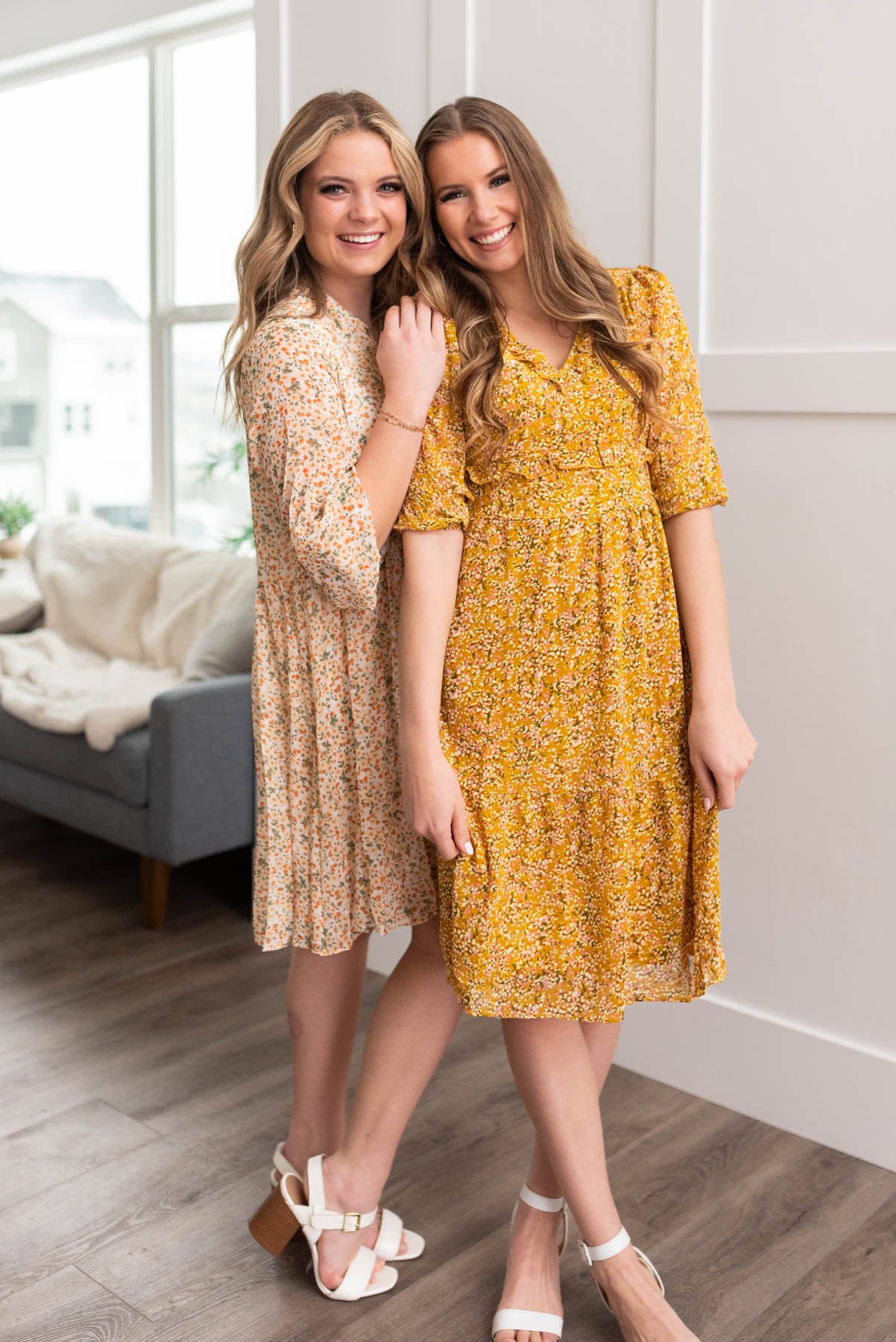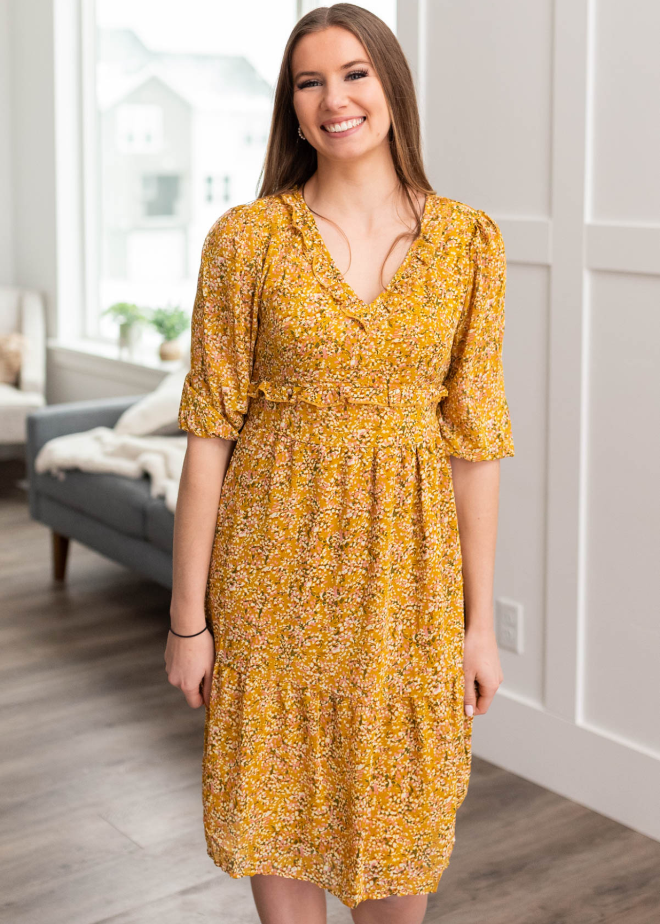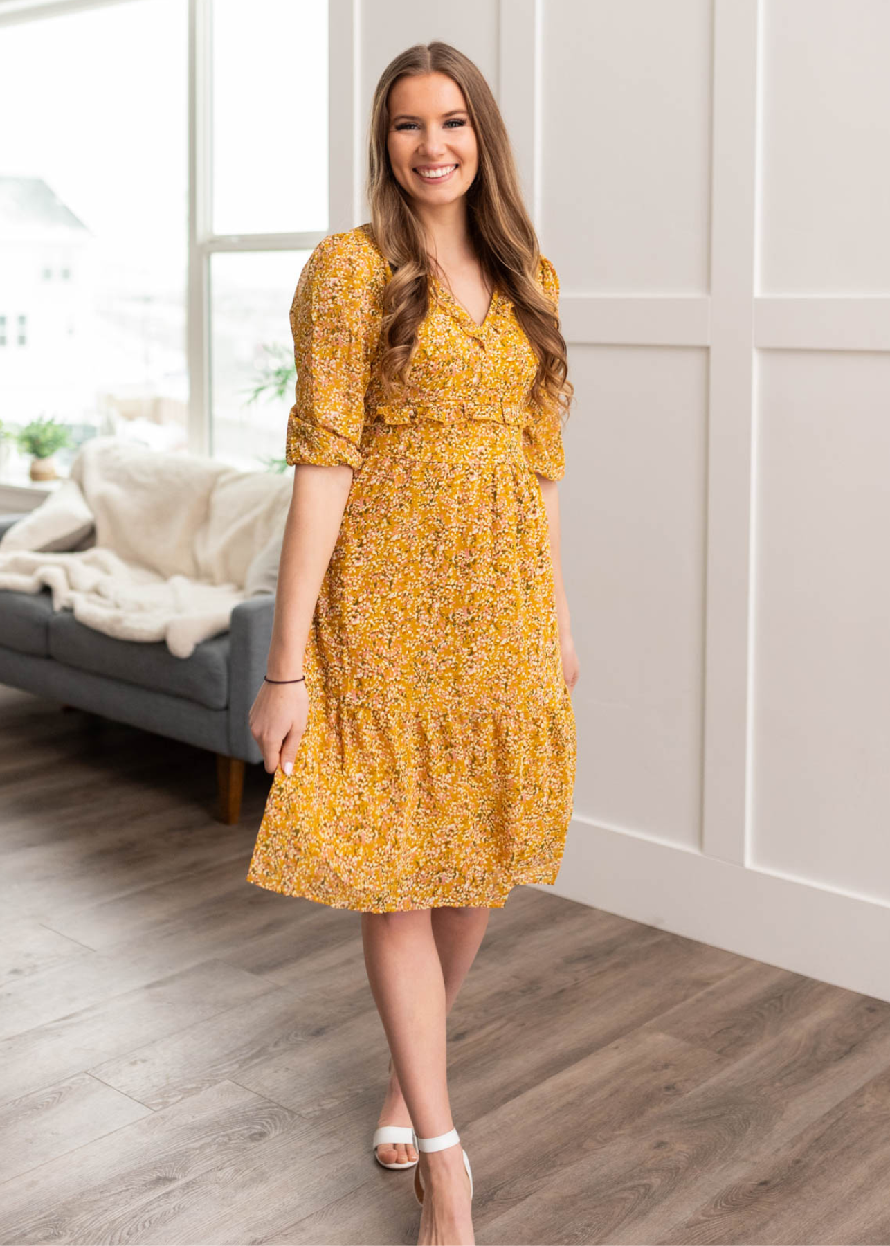 Short sleeve mustard floral dress with smocked bodice and v-neck