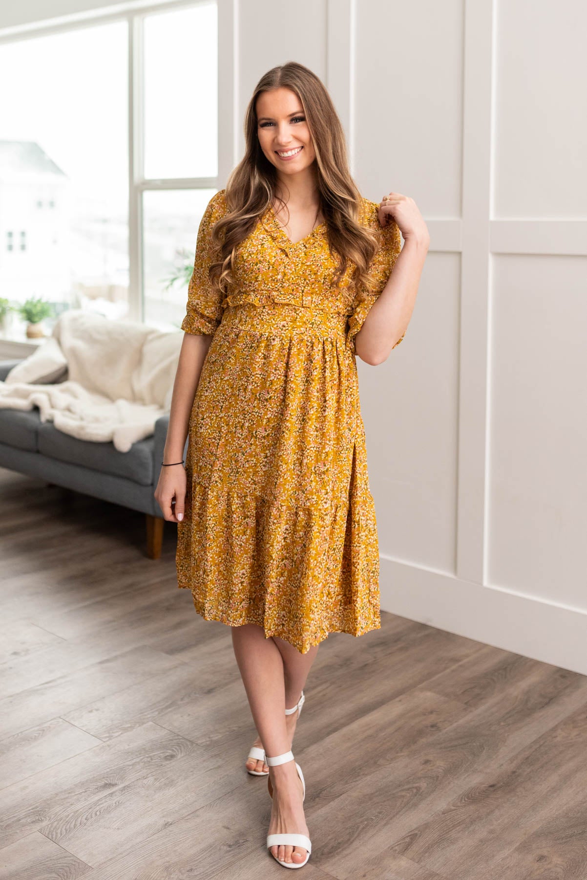 Short sleeve mustard floral dress with tired skirt and smocked bodice