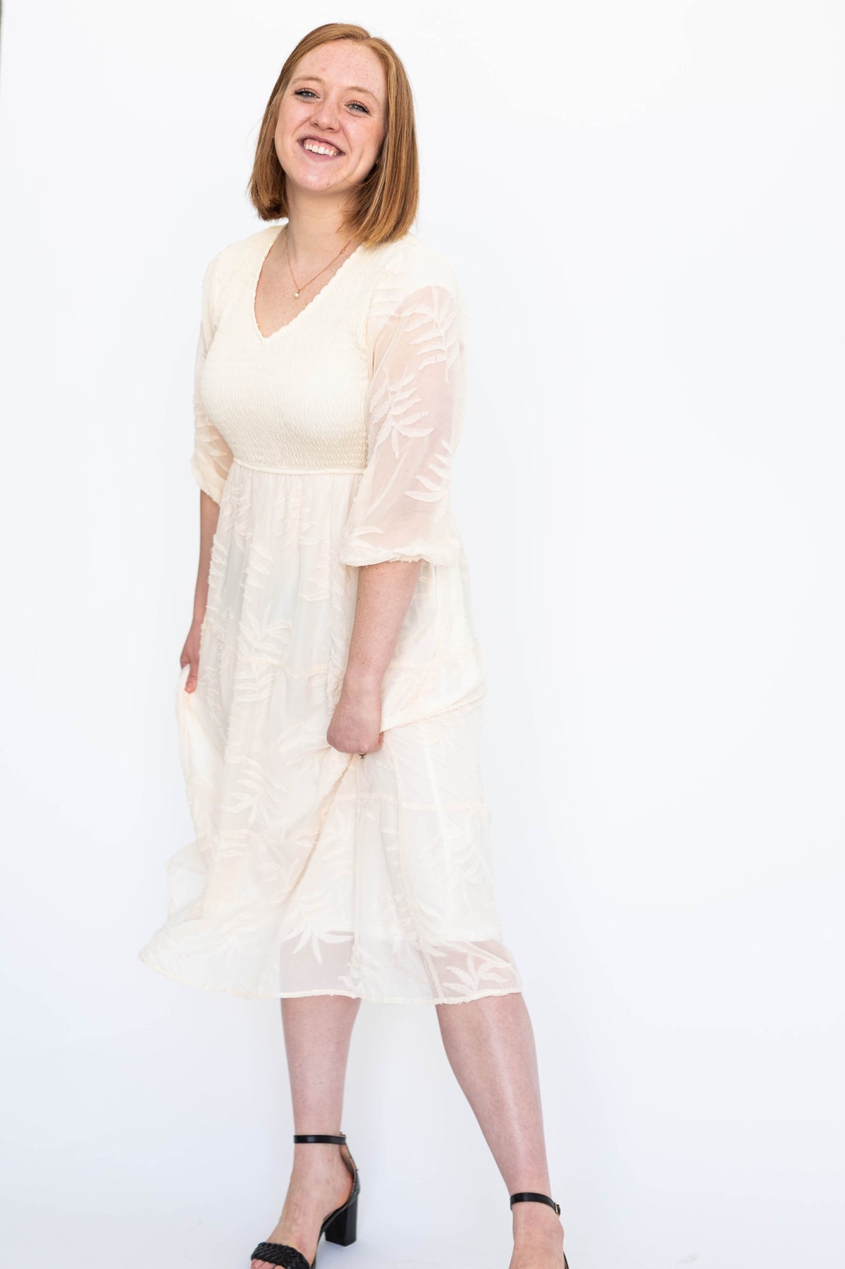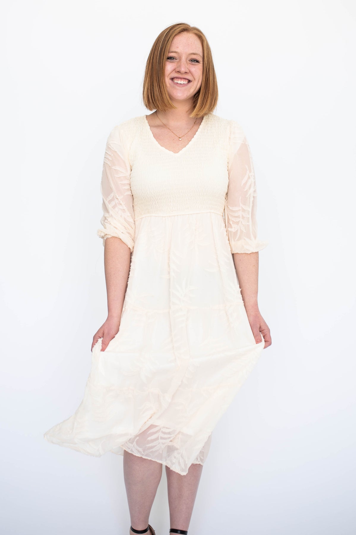 - Flattering v-neckline + flowy tiered skirt