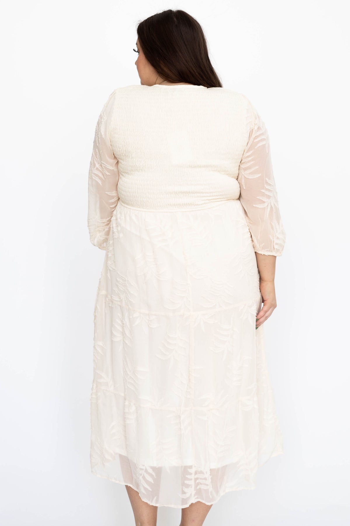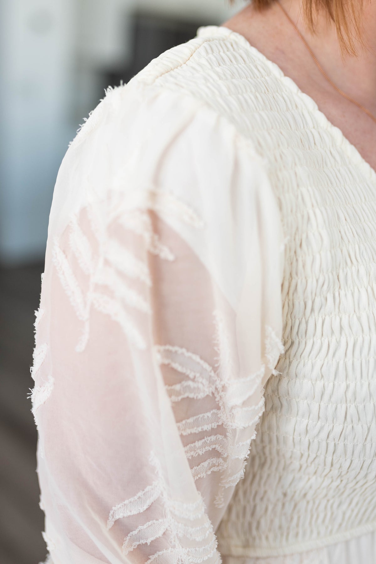 - 3/4 sleeves that are sheer except for top shoulder