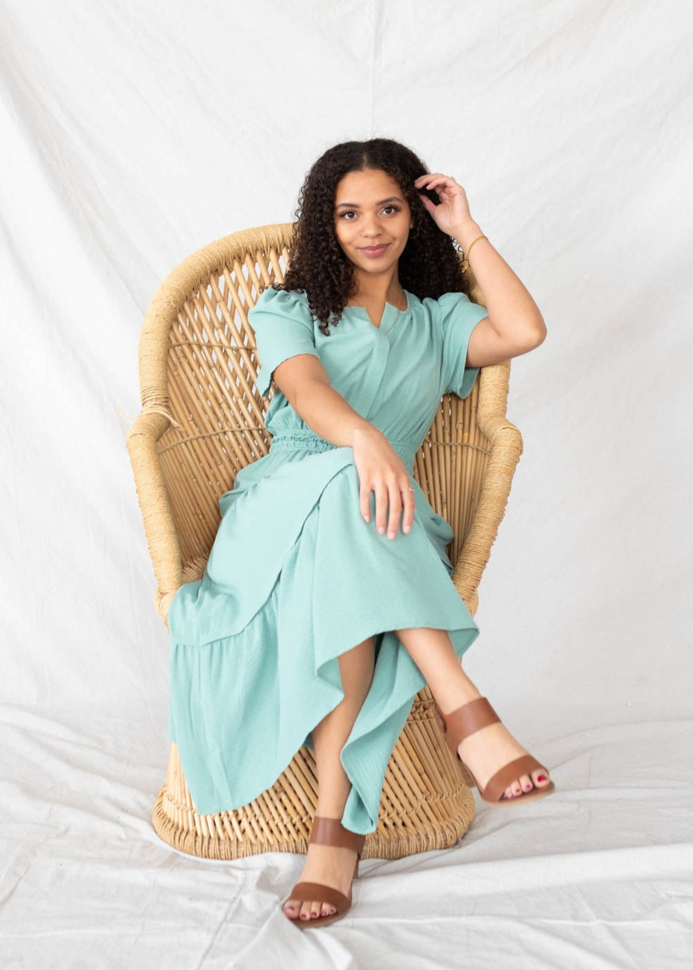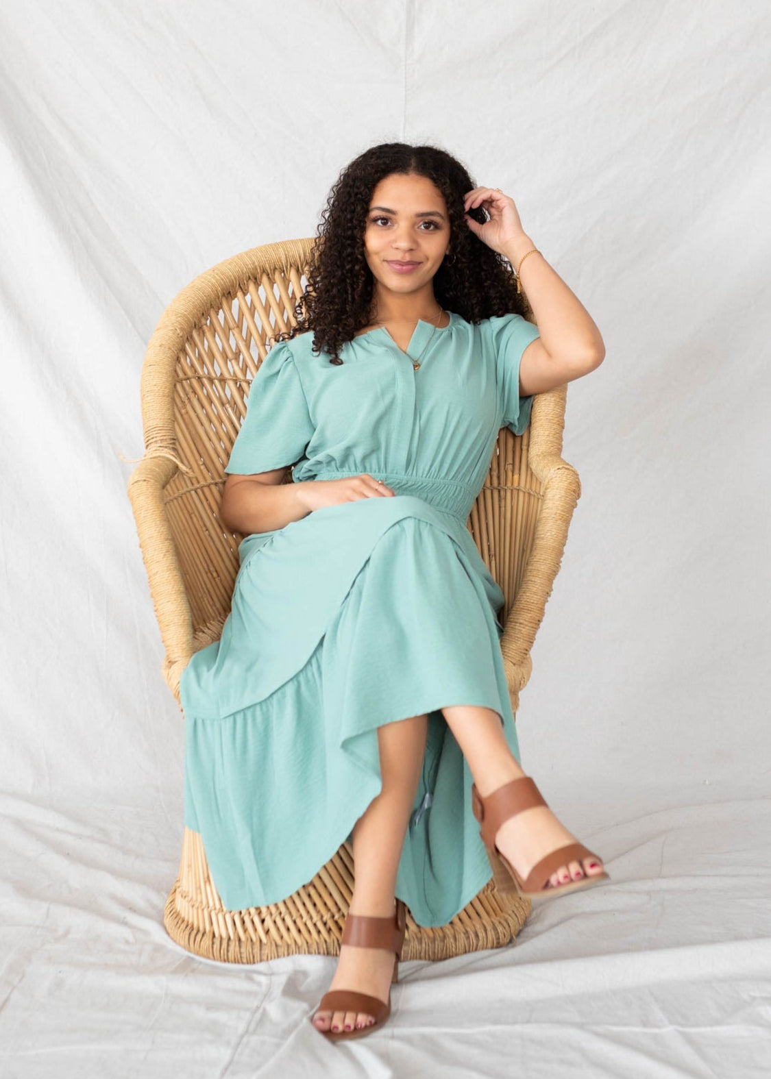 - Functioning buttons that are slightly hidden with fabric on neckline