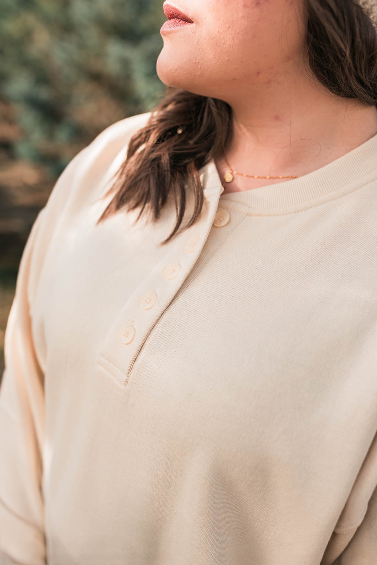 Cream fleece sweatshirt with buttons at the neck