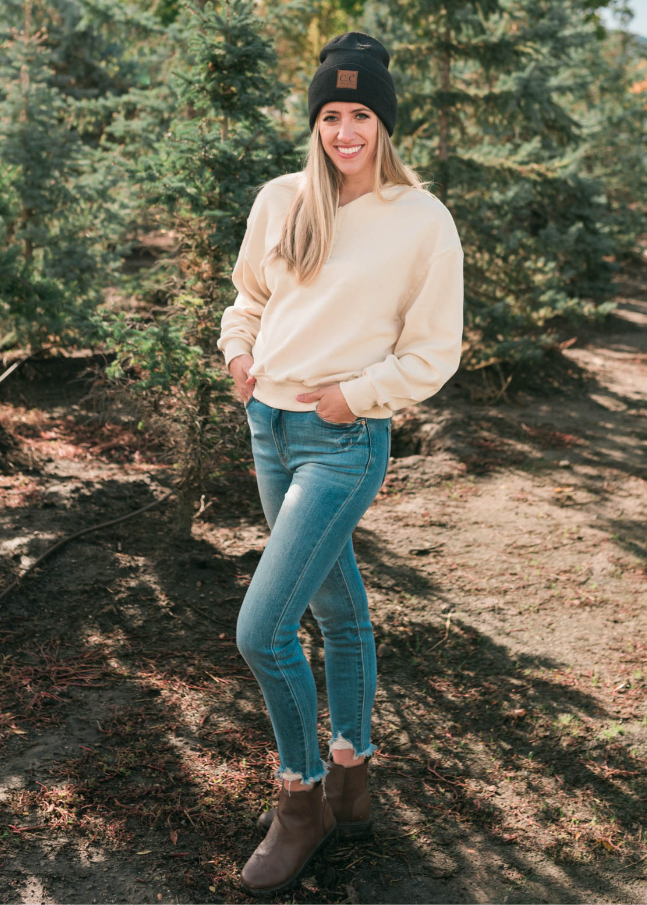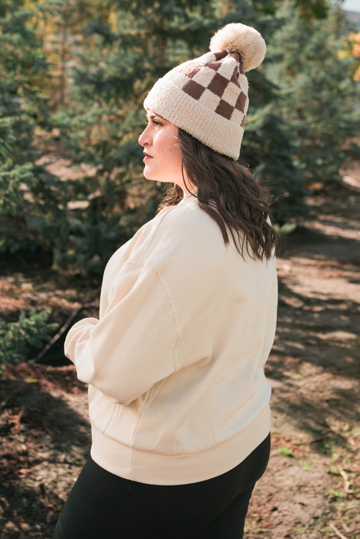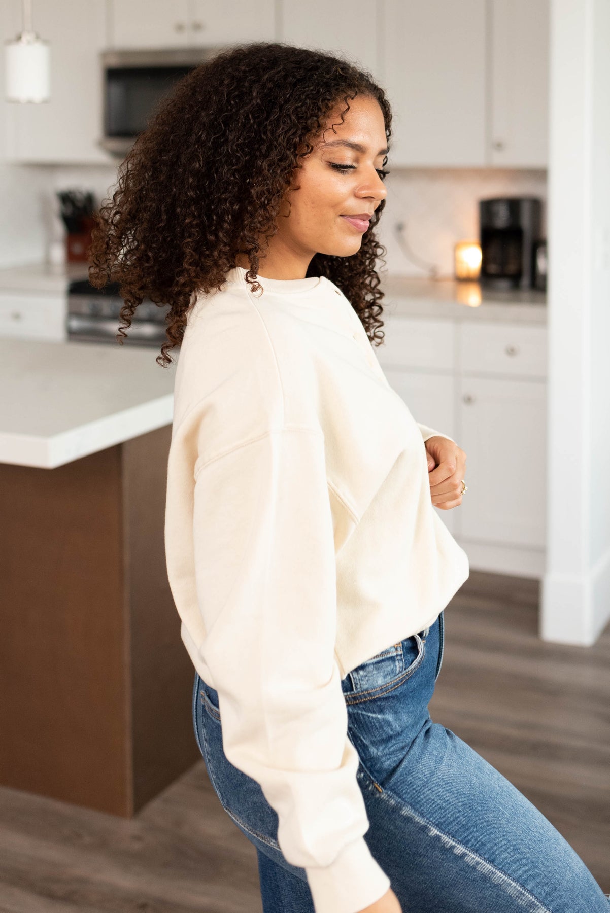 Side view of the cream fleece sweatshirt