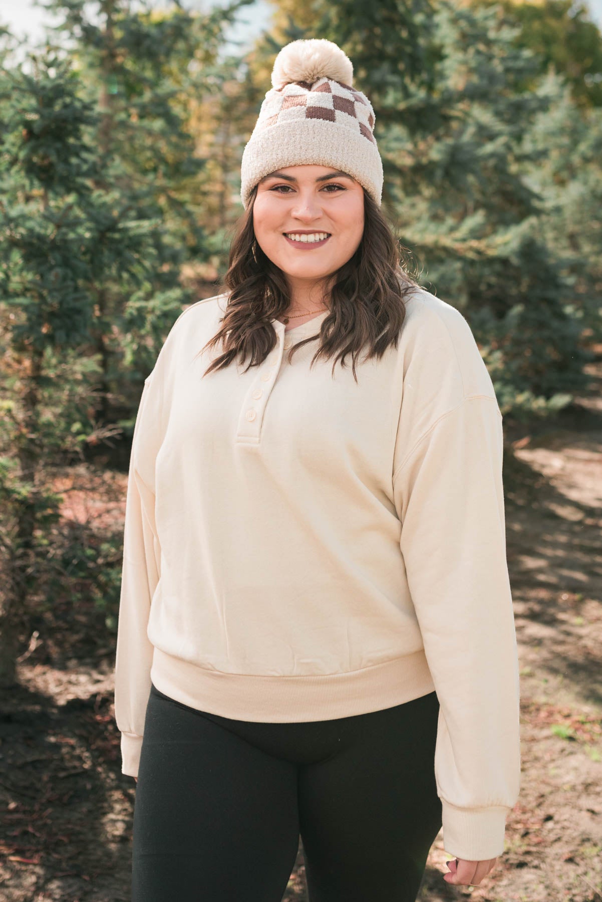 Buttons on a plus size cream fleece sweatshirt