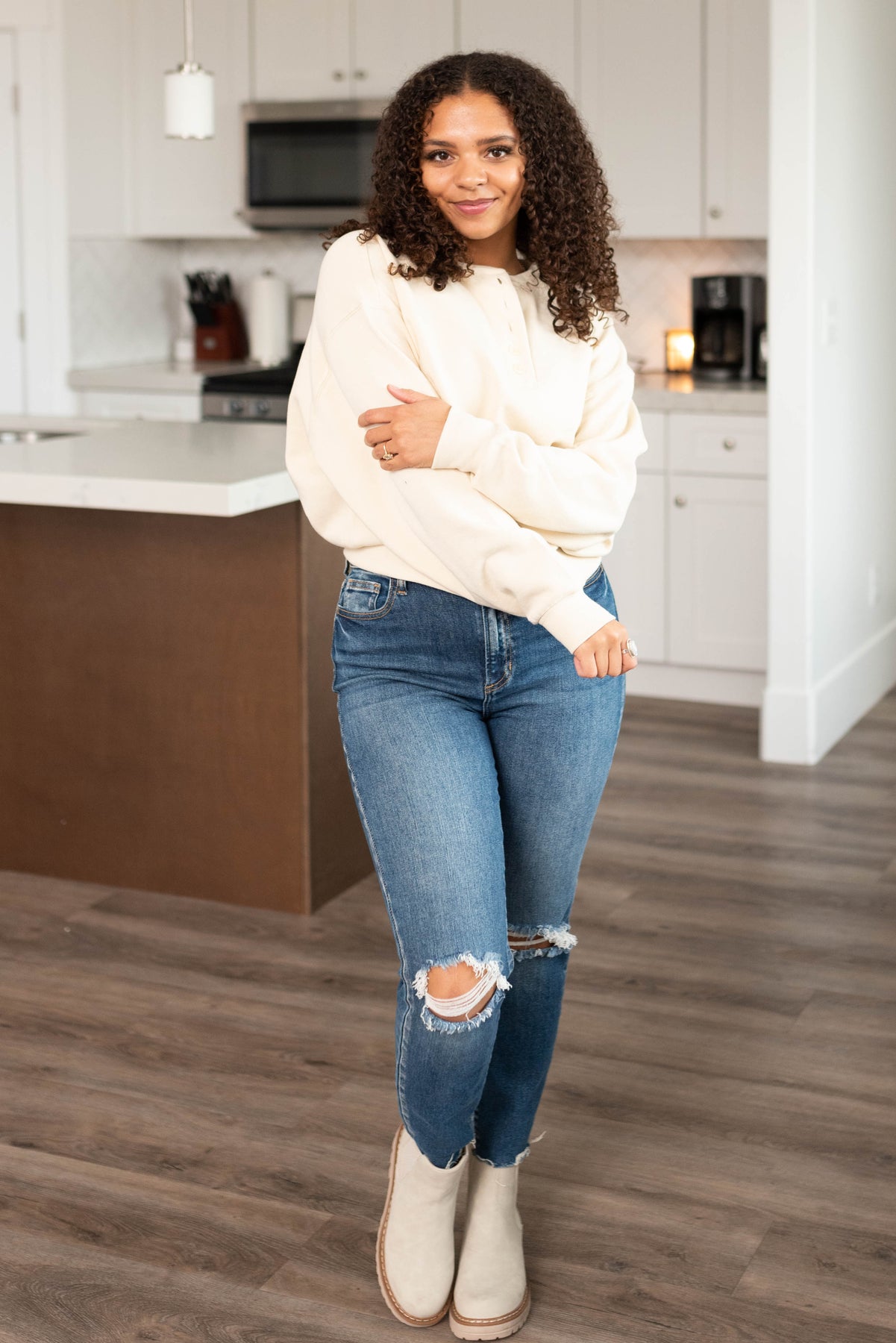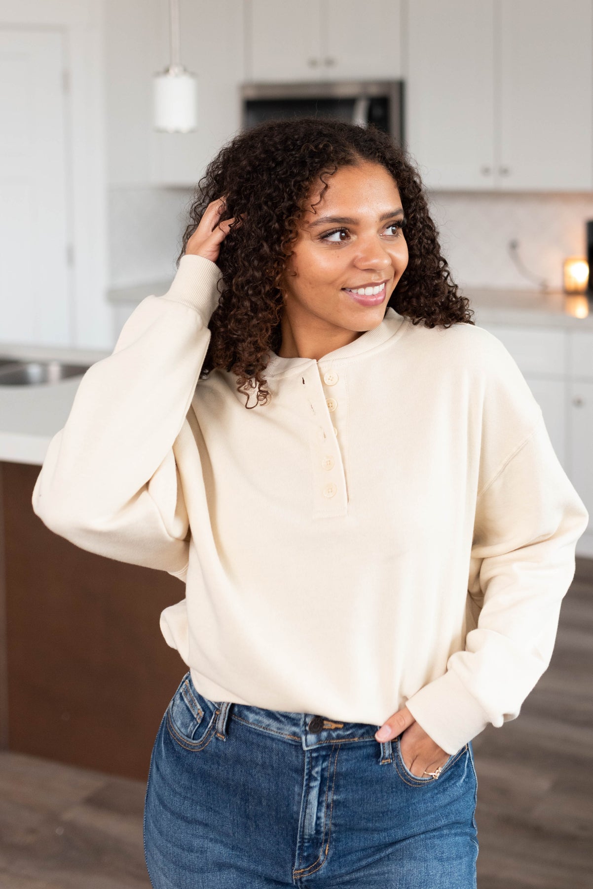 Long sleeve cream fleece sweatshirt with buttons at the neck