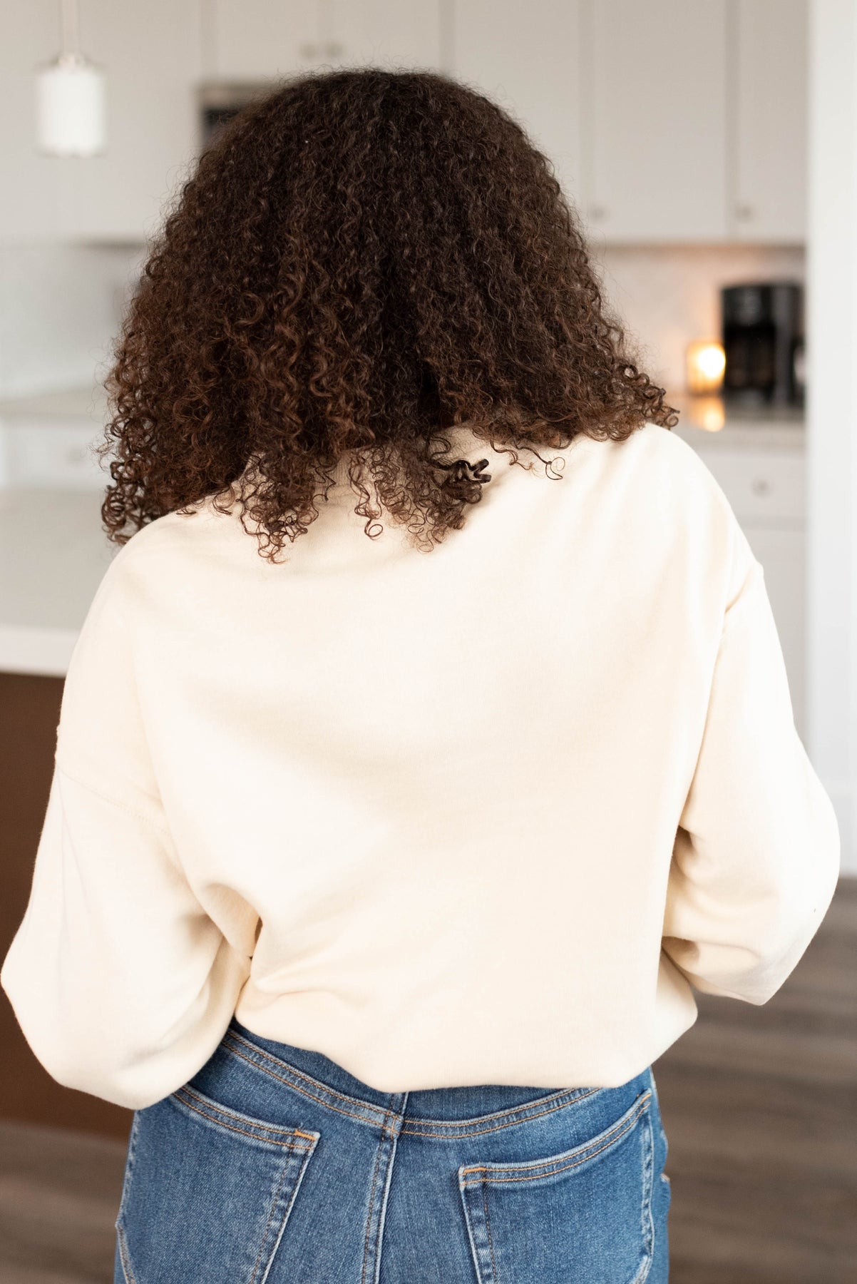 Back view of a cream fleece sweatshirt
