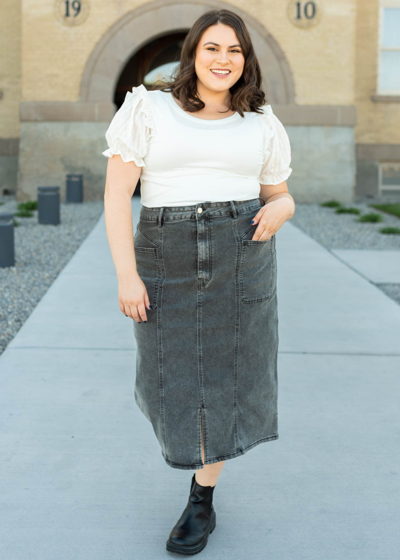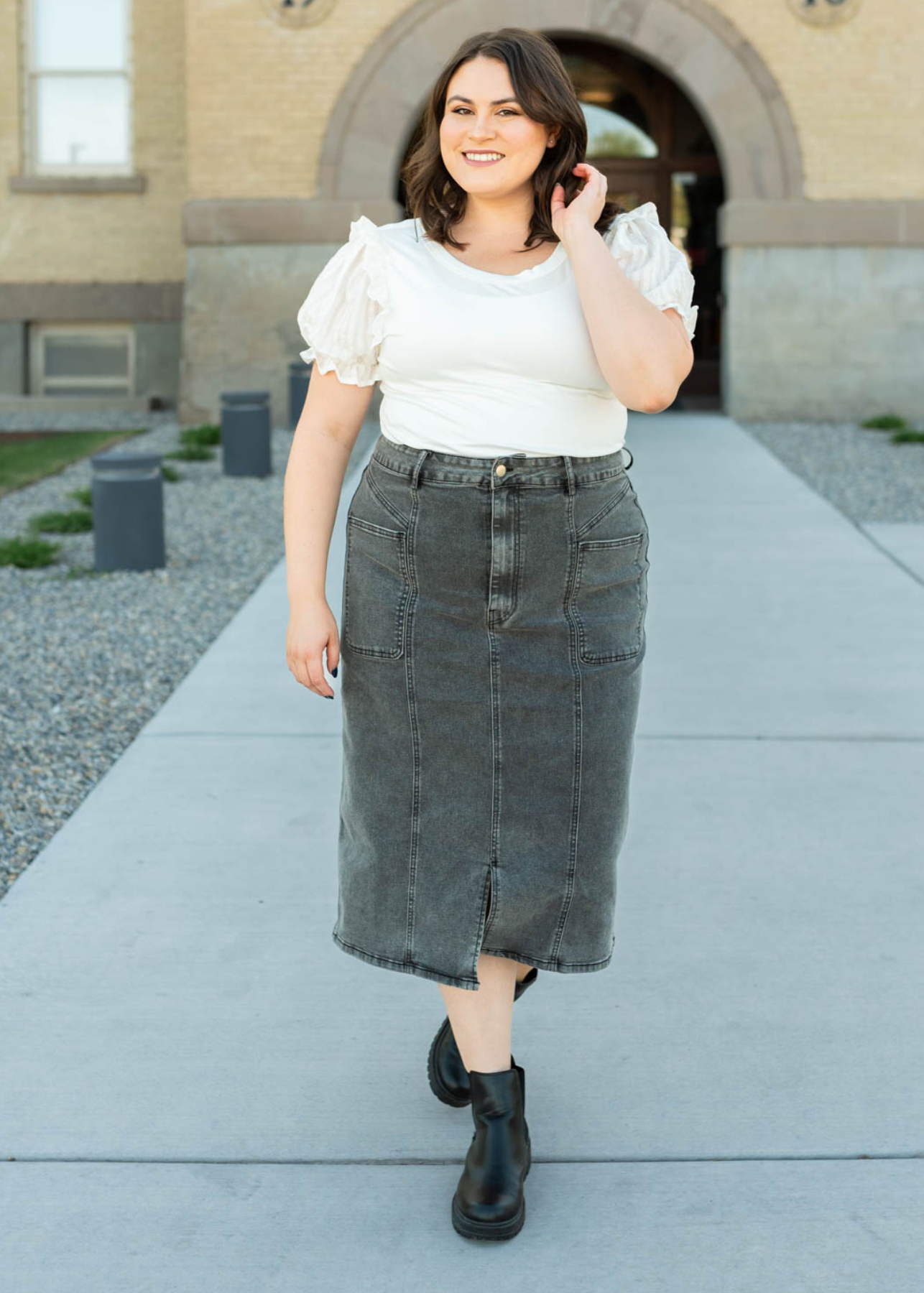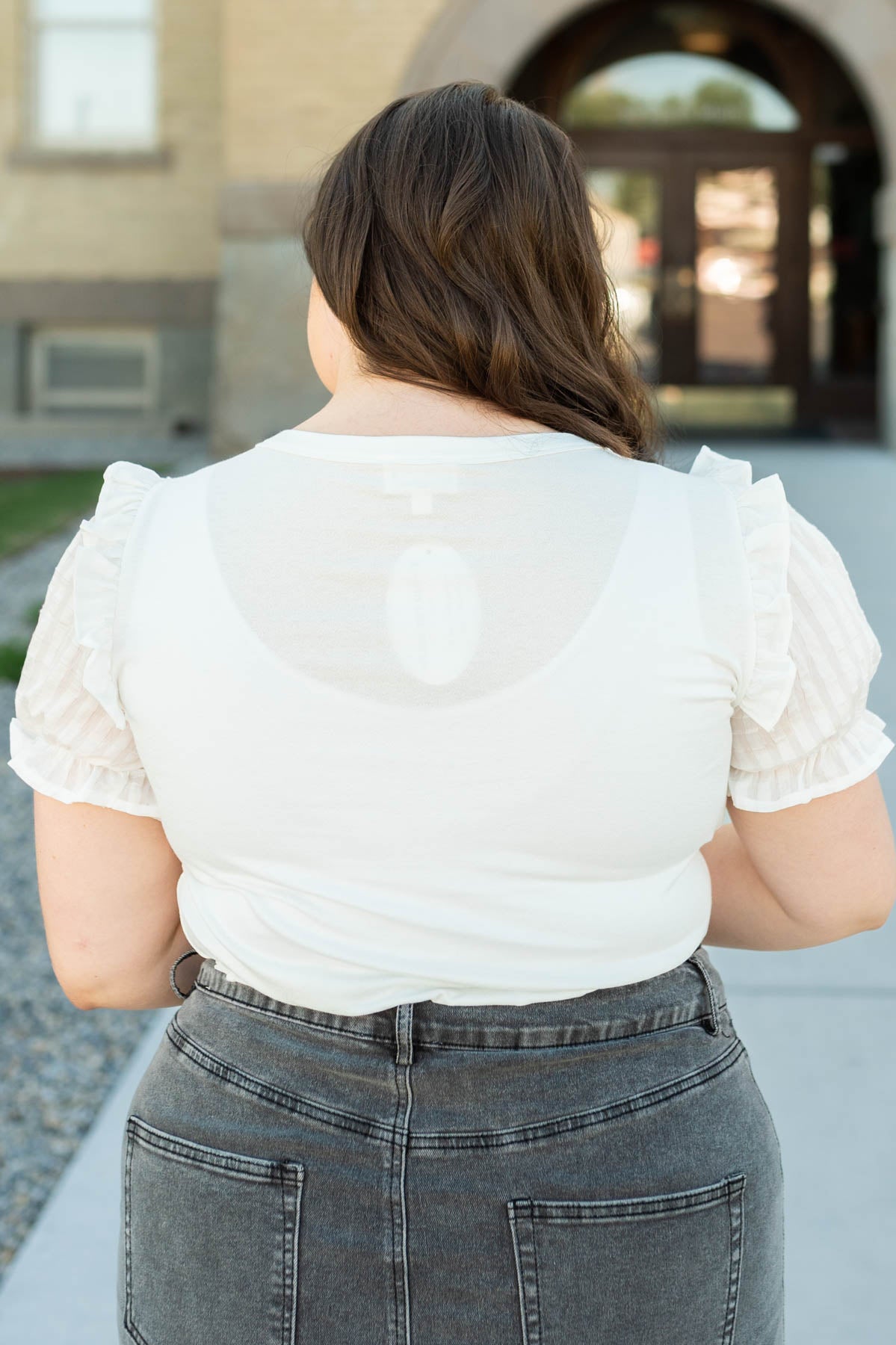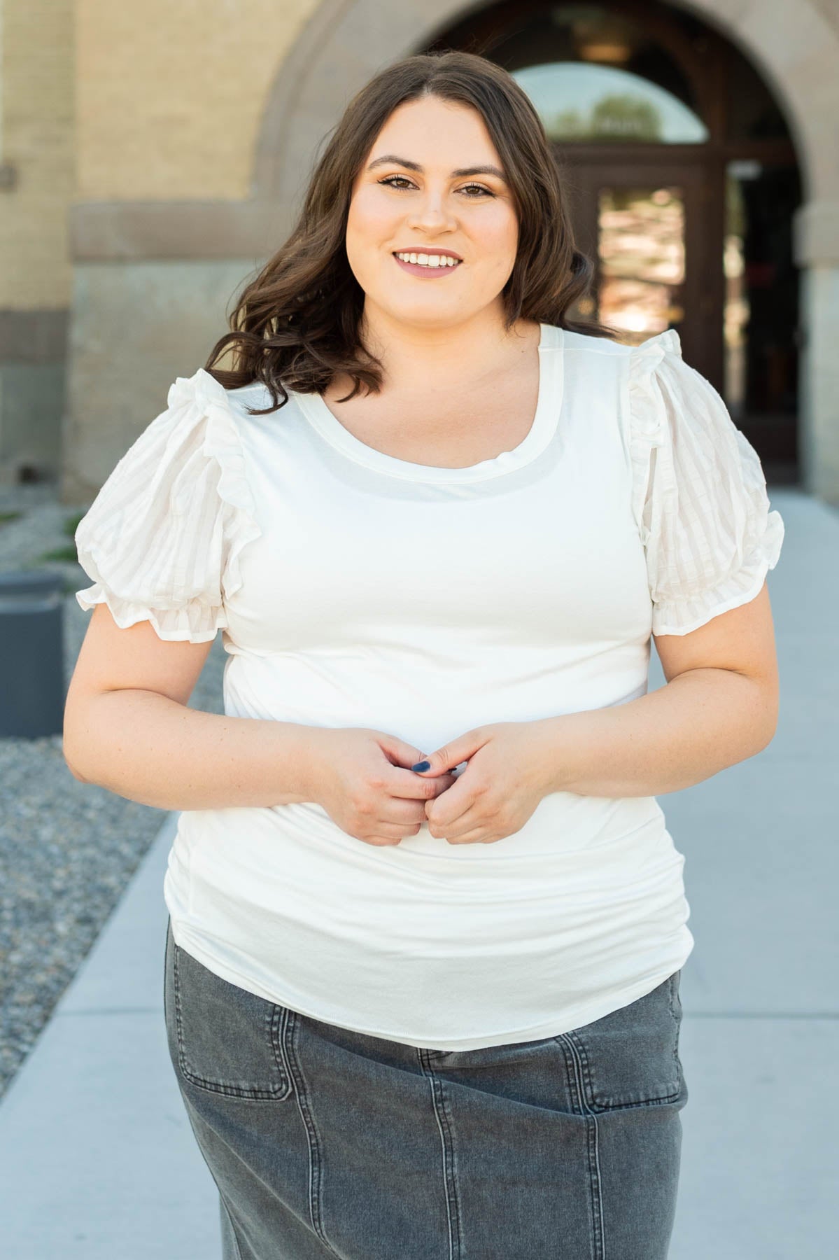 Side view of a plus size short sleeve white top with a ruffle on the sleeve