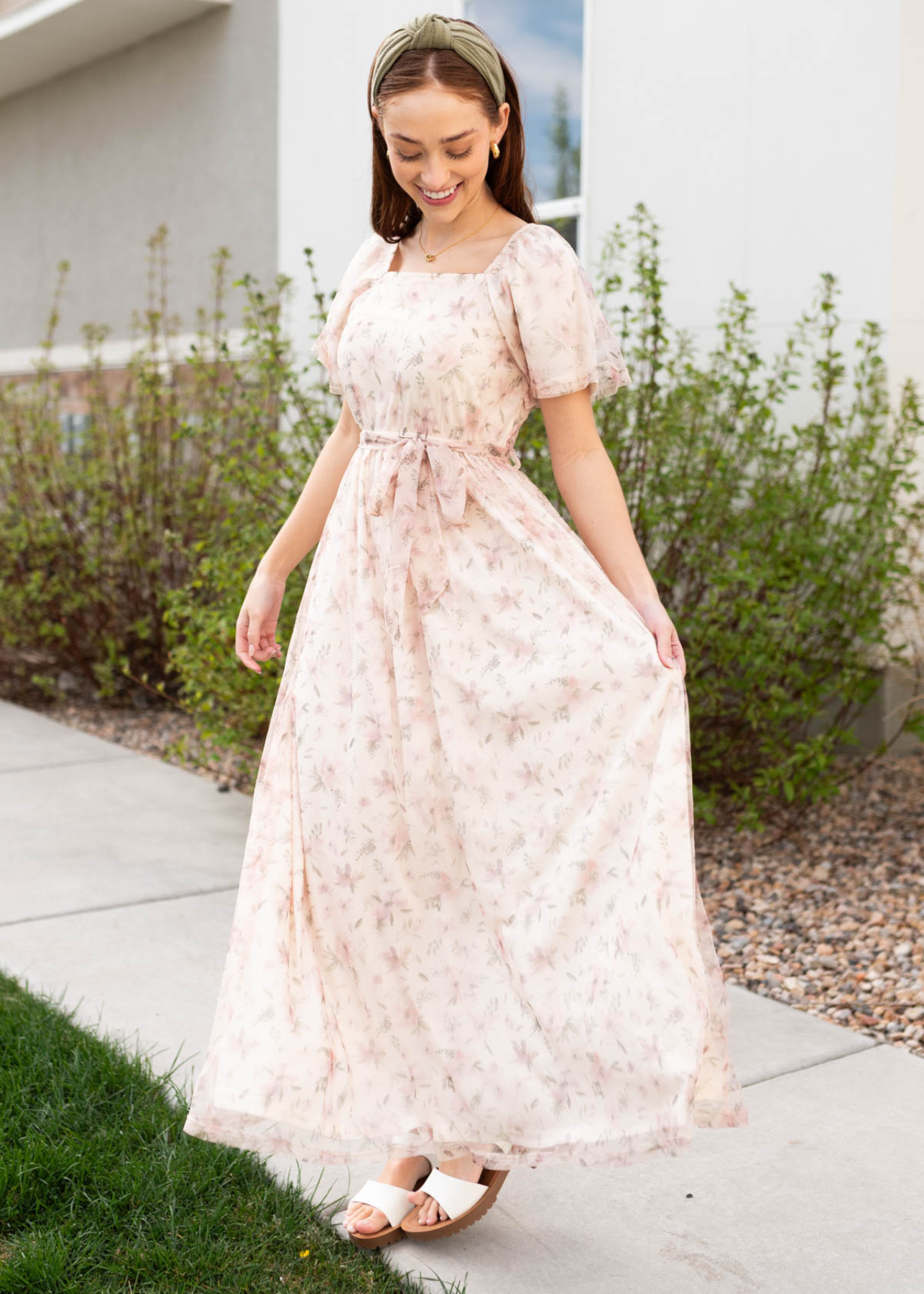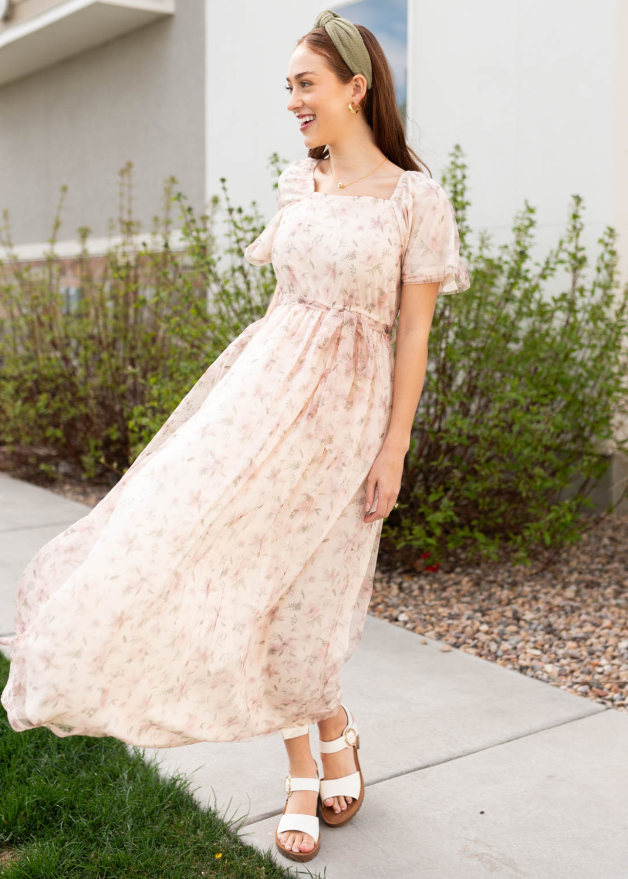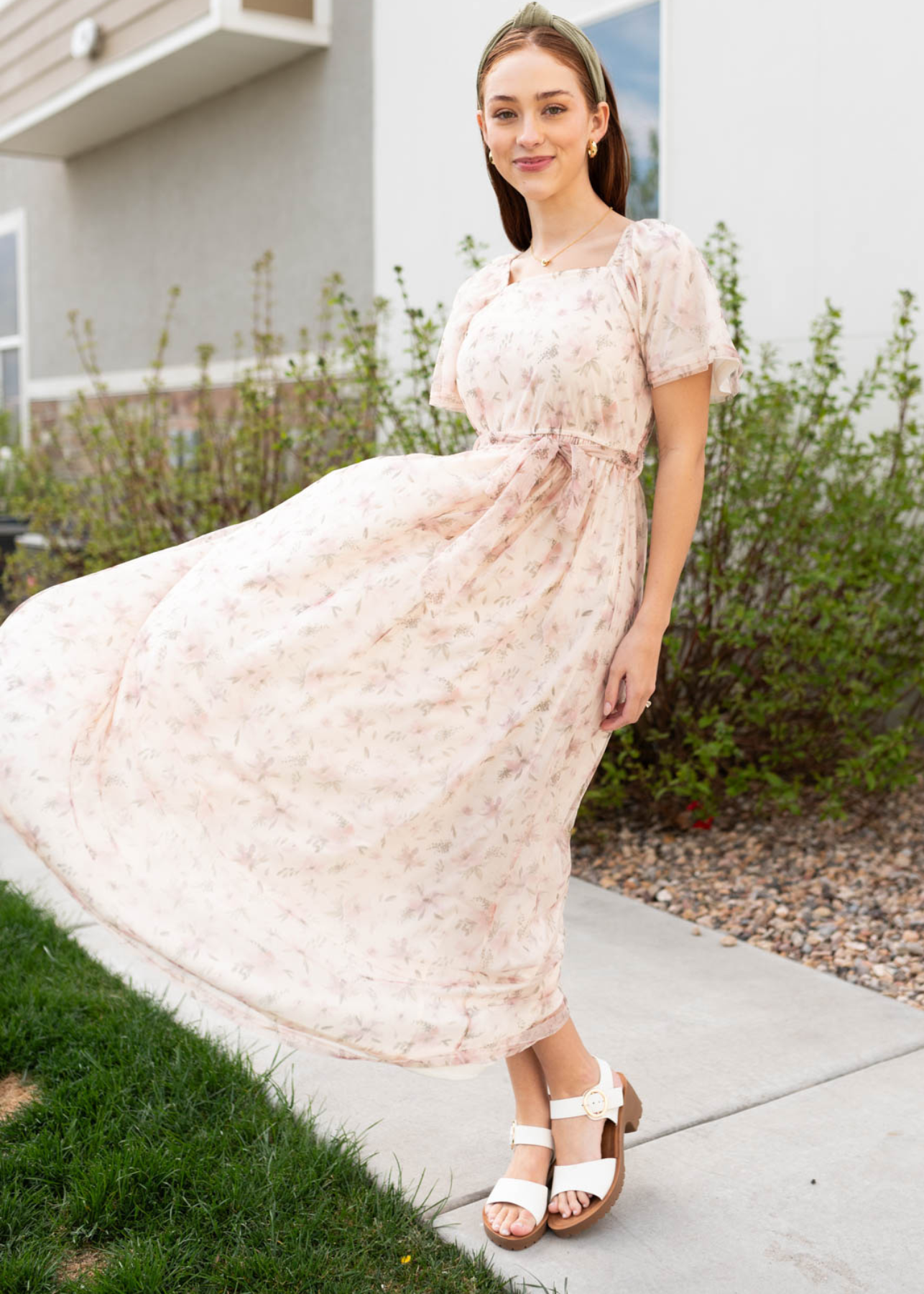 Side view of the ivory floral dress