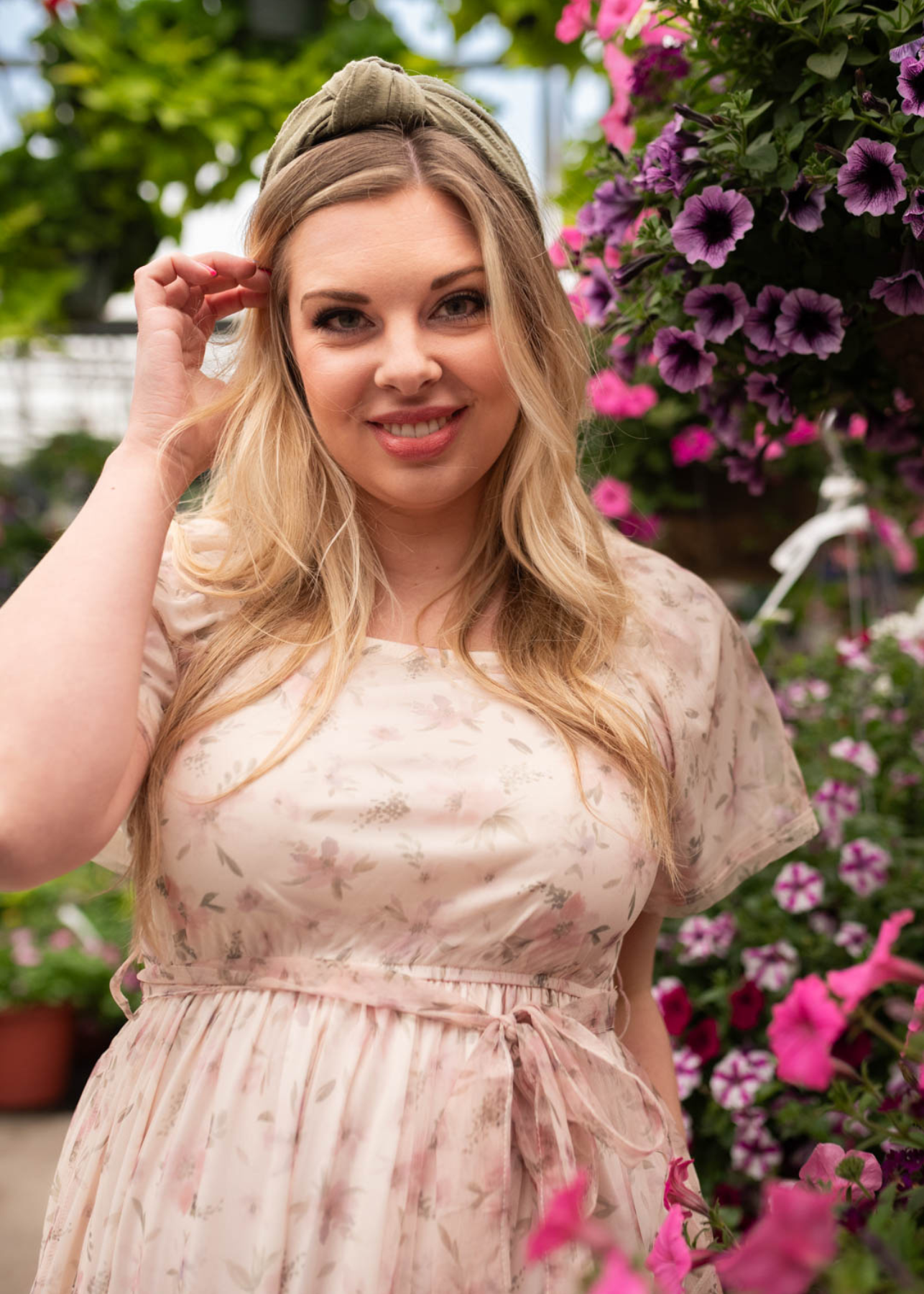 Close up of the fabric and tie on the waist of the ivory floral dress