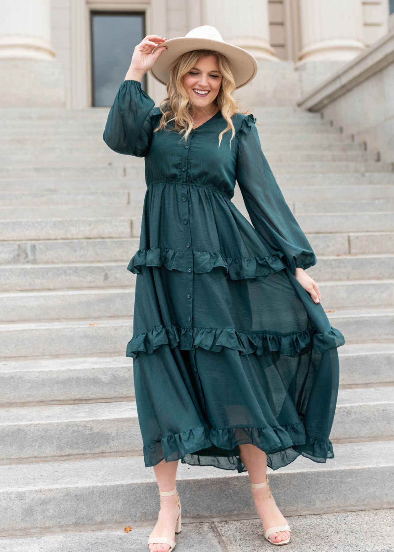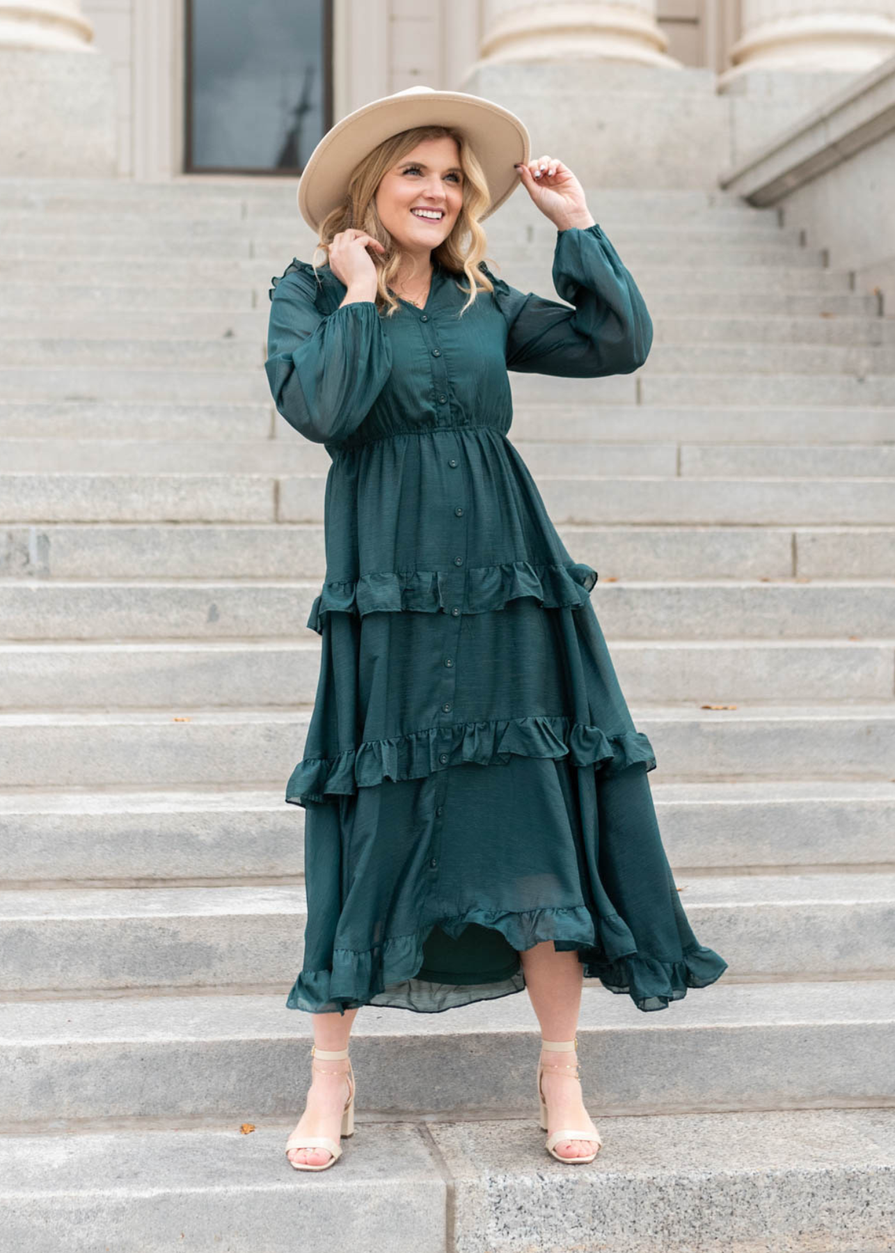 Button up hunter green tiered dress with long sleeves