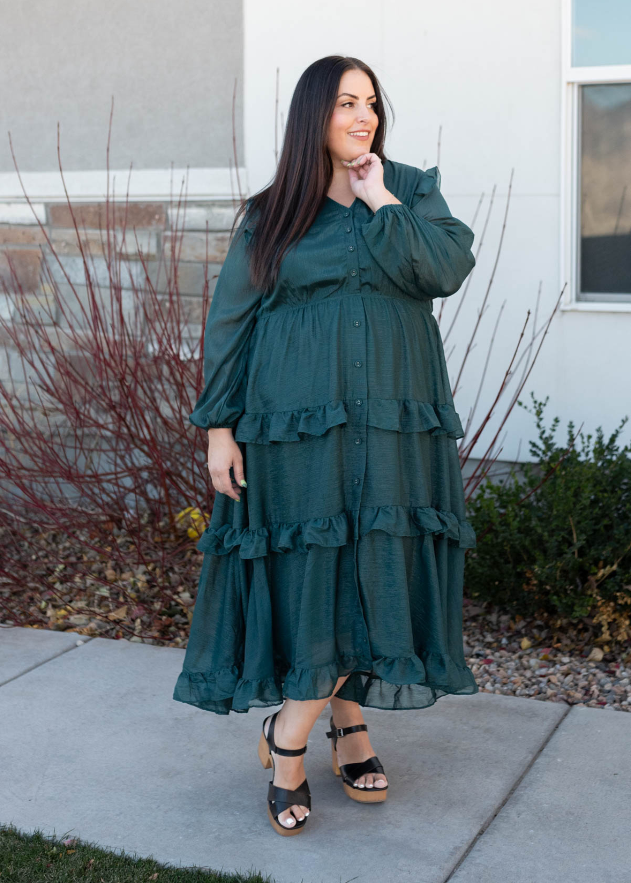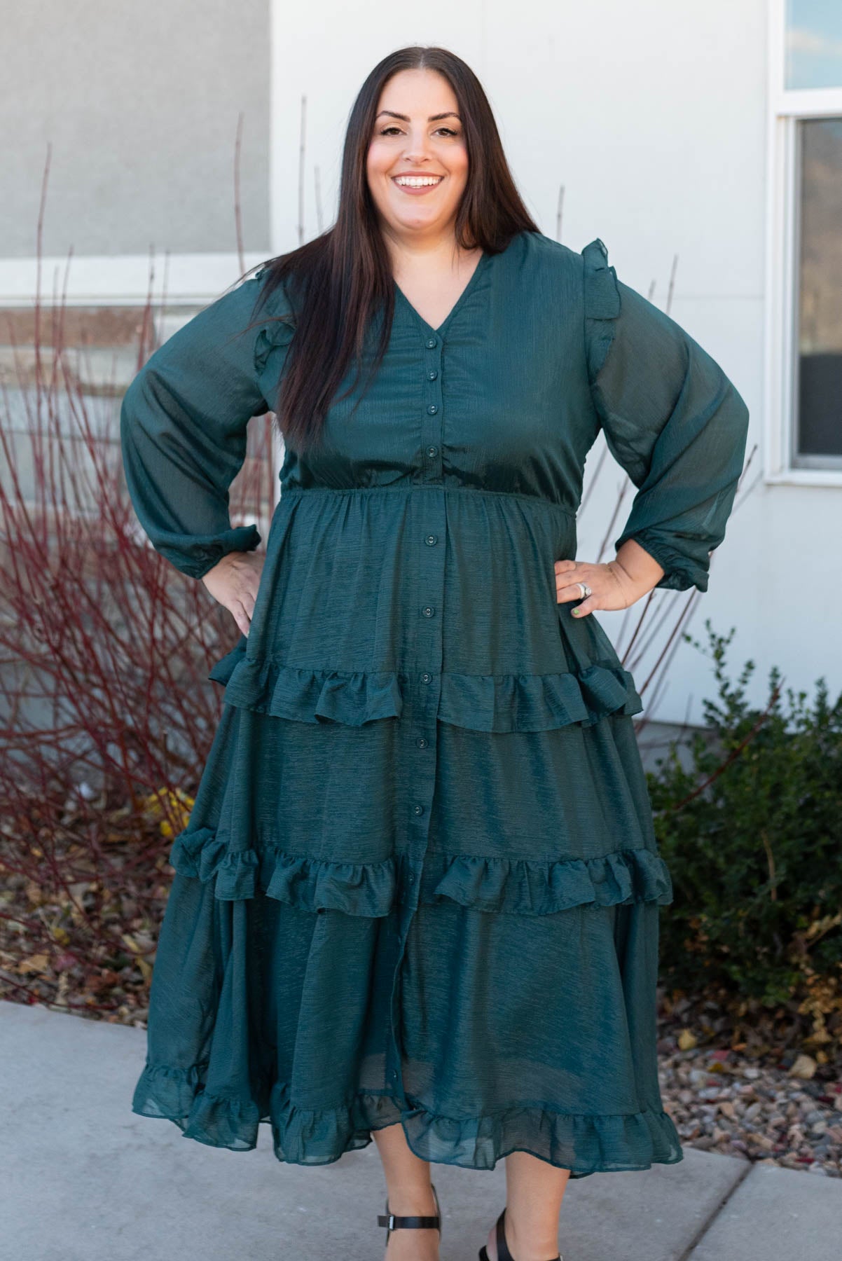 Long sleeve button up plus size hunter green tiered dress