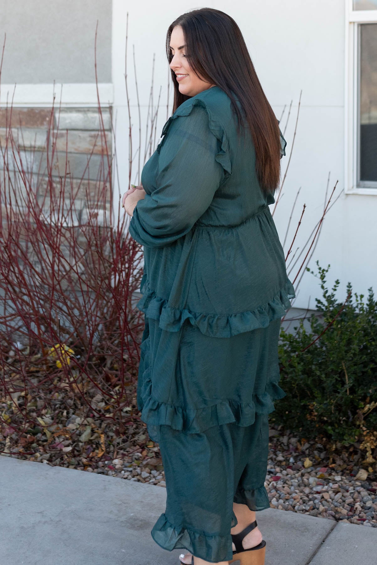 Side view of a long sleeve hunter green tiered dress