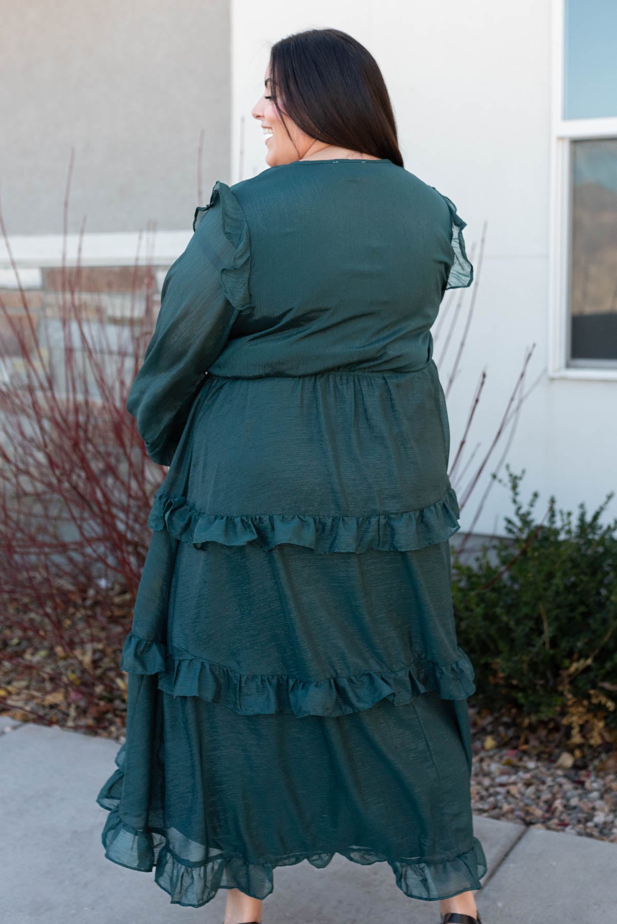 Back view of a plus size hunter green tiered dress