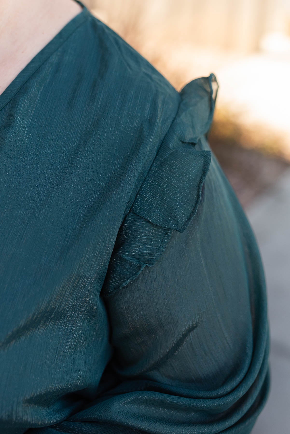 Clouse up of the ruffle on the sleeve of a plus size hunter green tiered dress