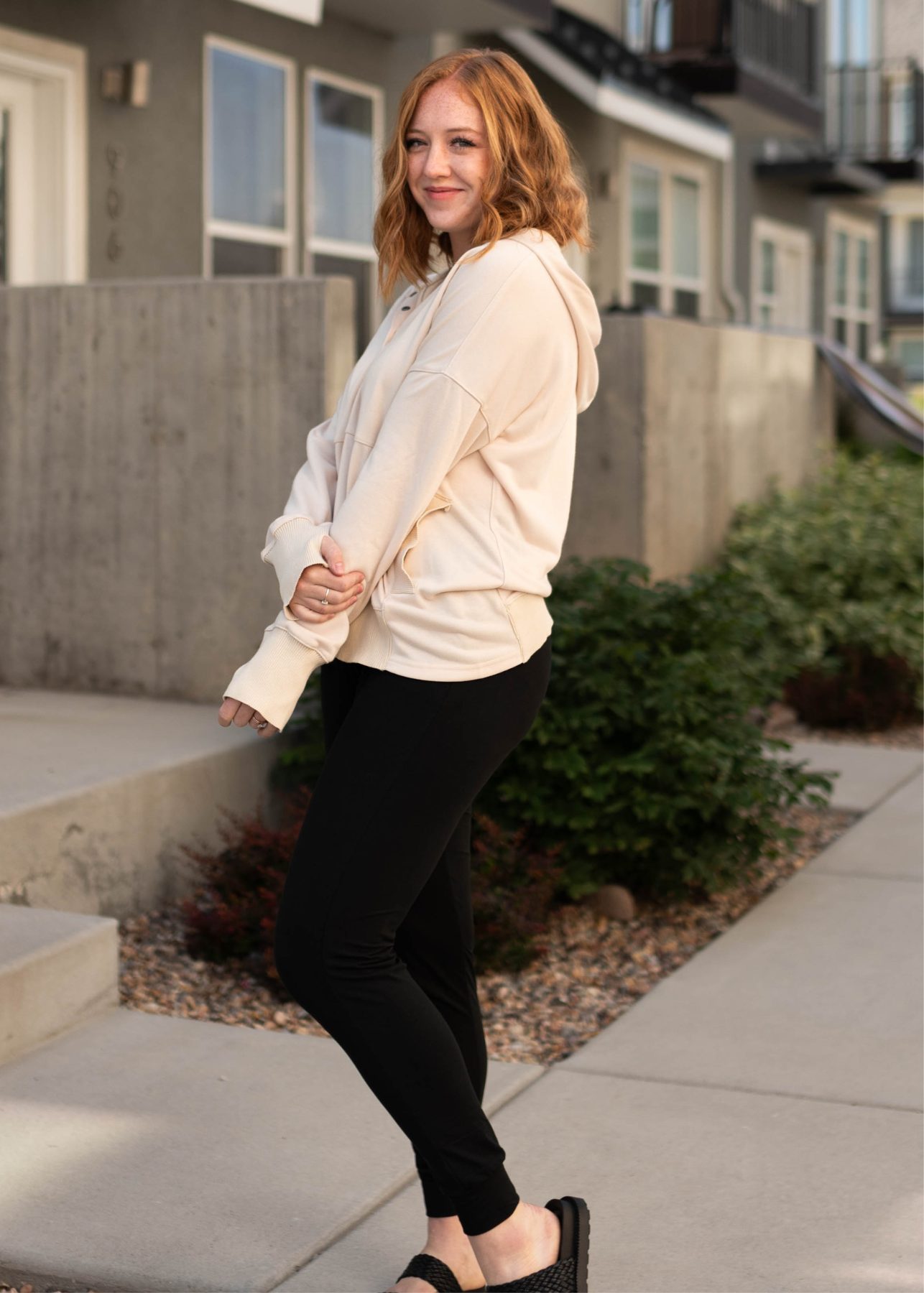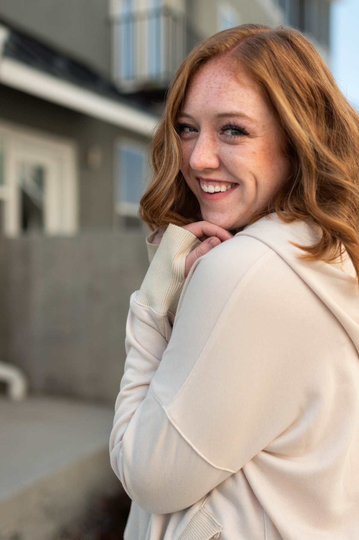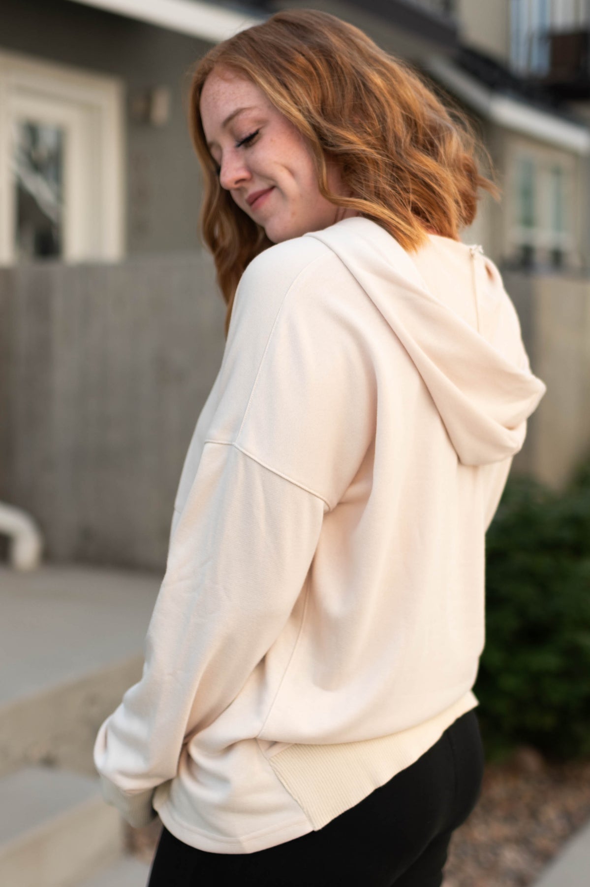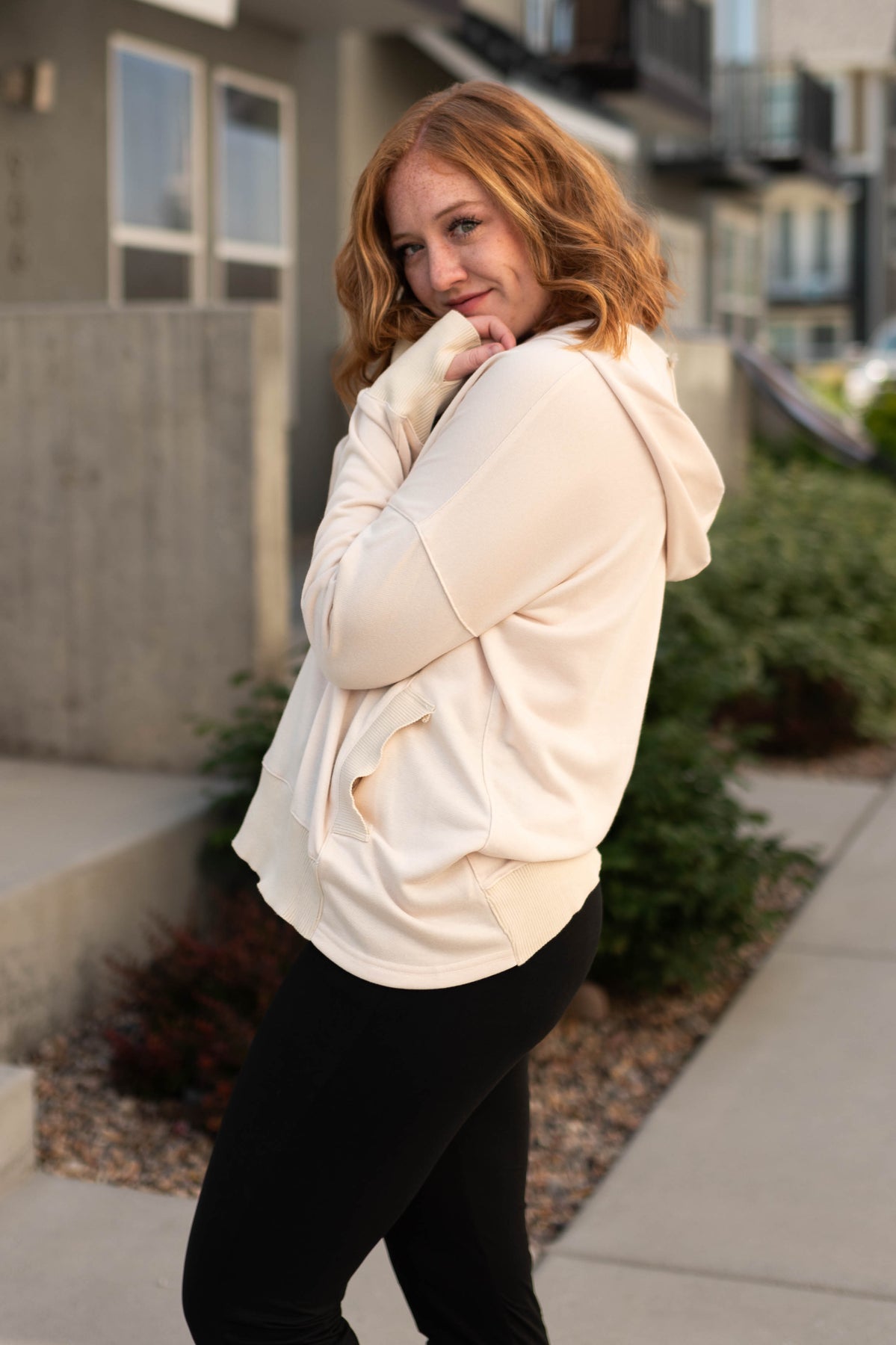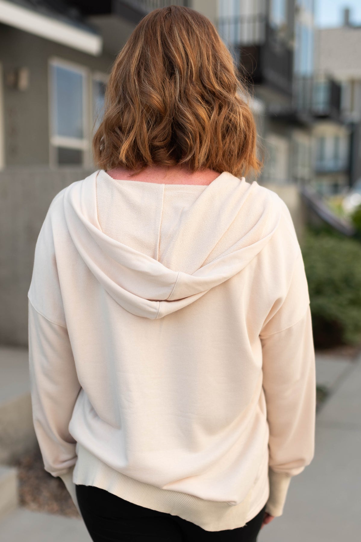 Long sleeve oatmeal hoodie with thumb holes in the sleeve cuffs