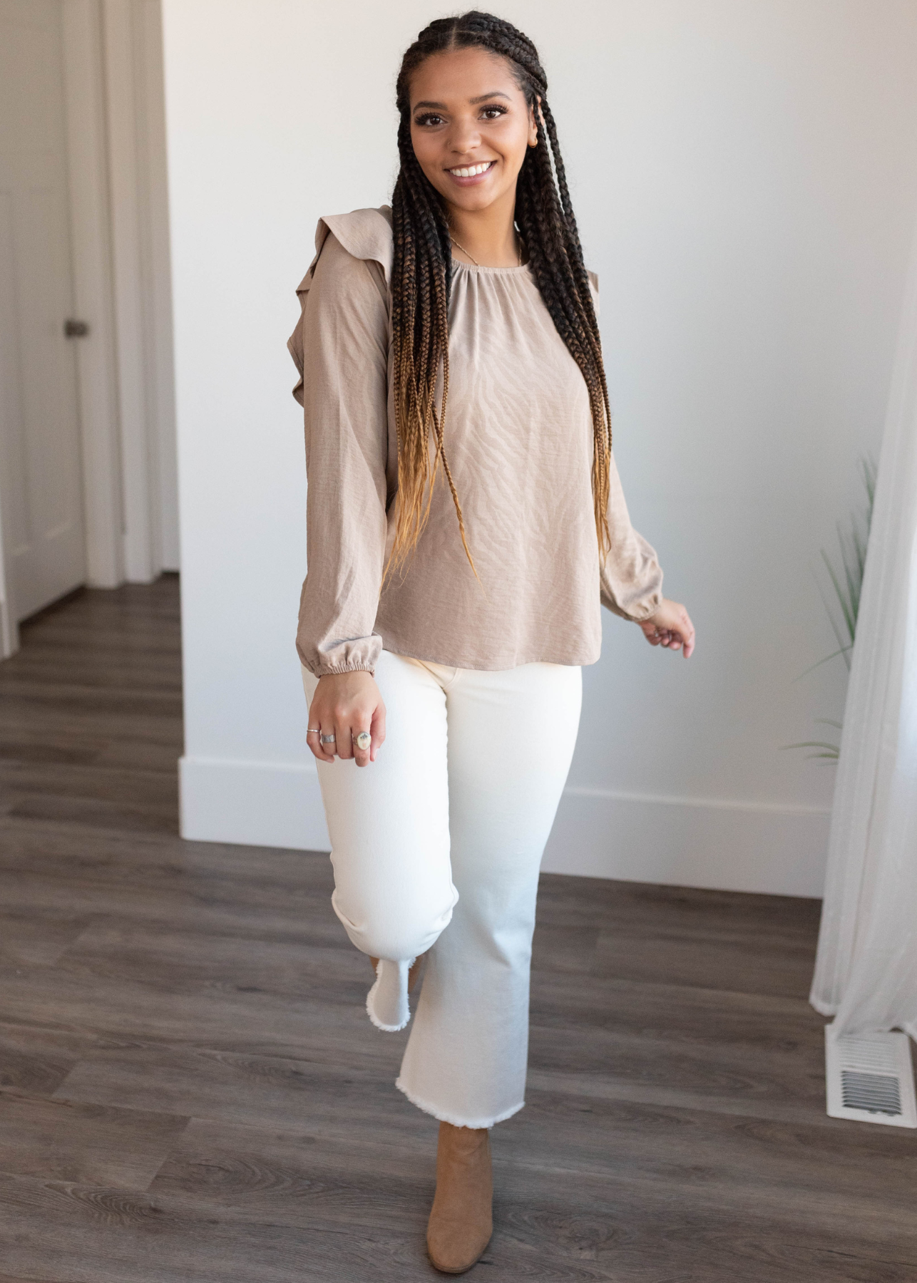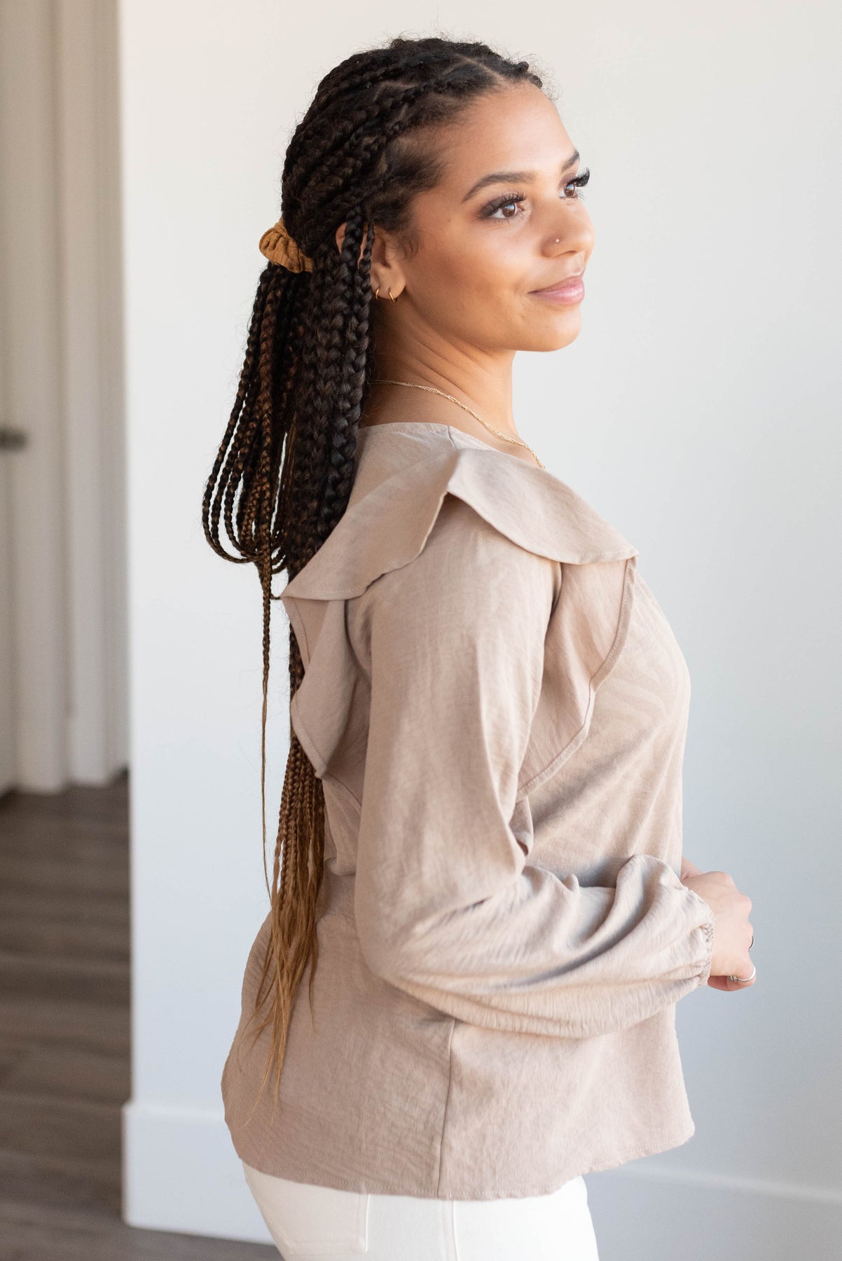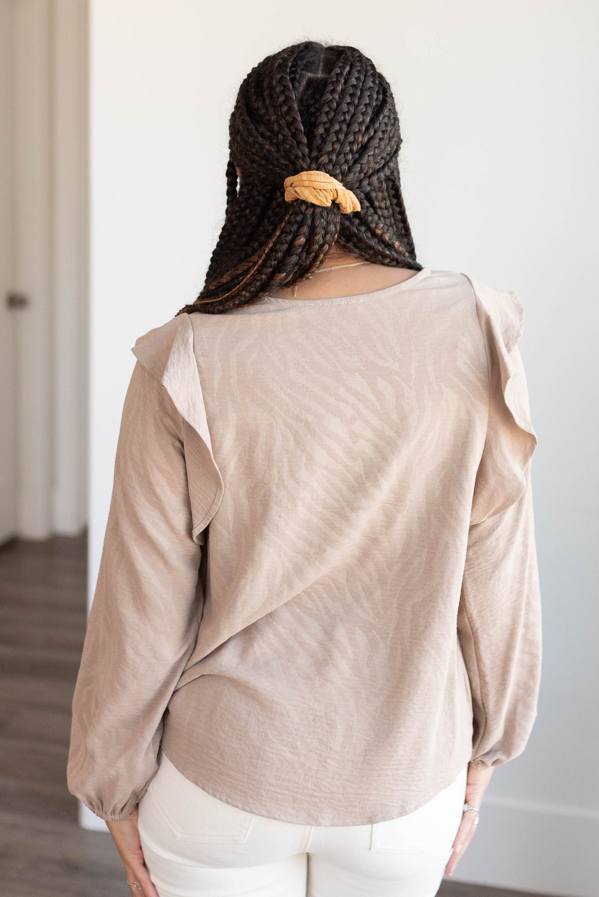 Beige long sleeve top with ruffle on the shoulder