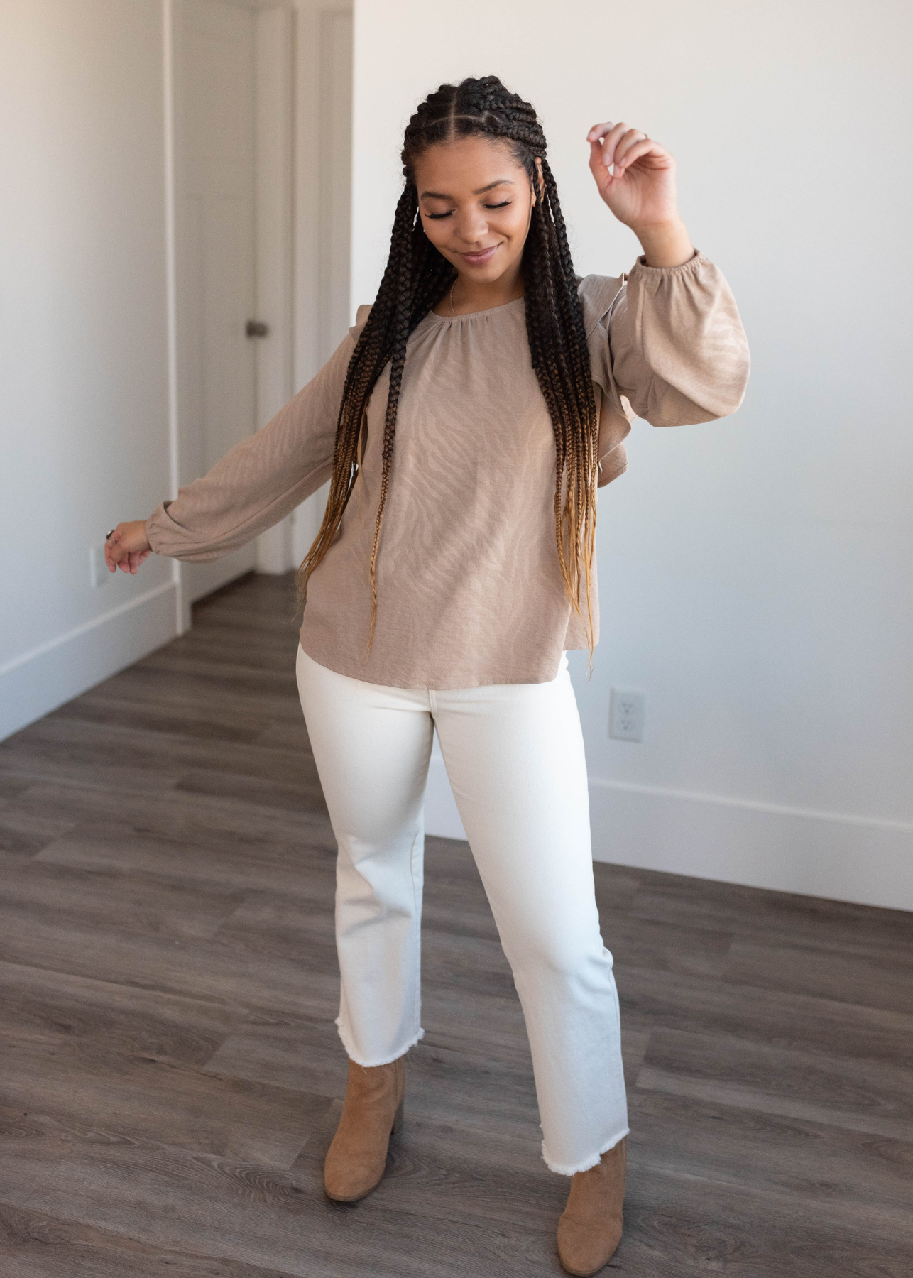 Close up of the sleeve on the beige long sleeve top