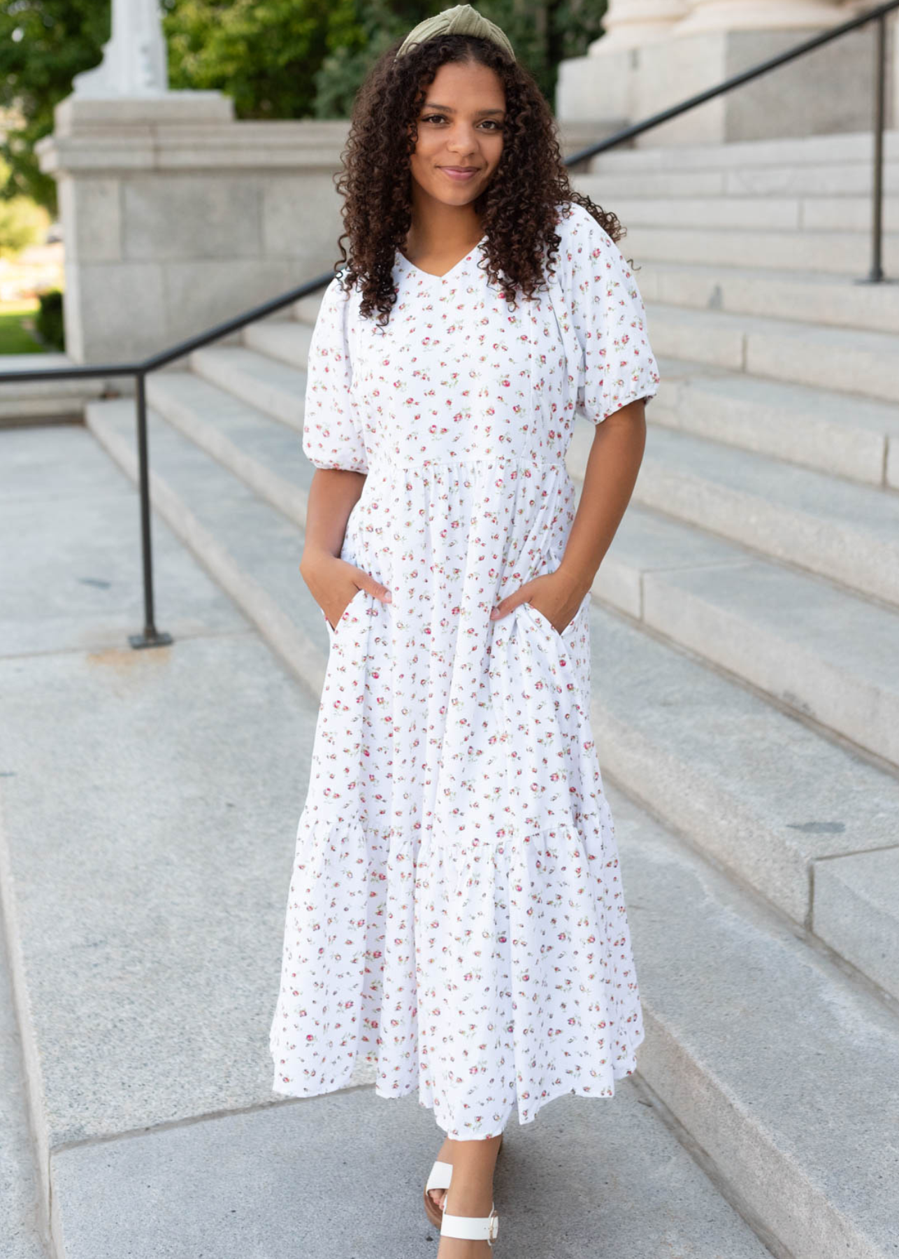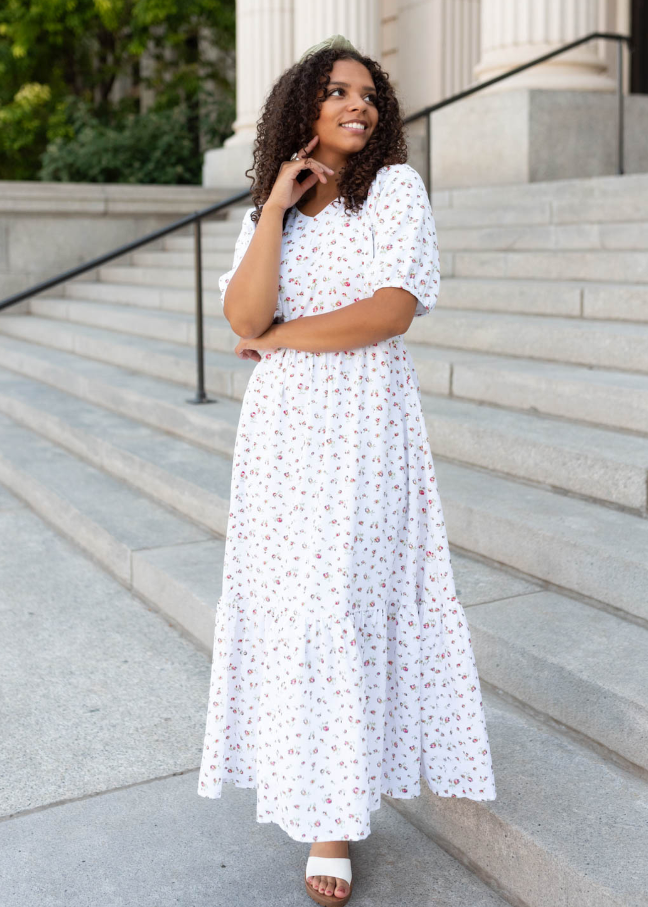 - Subtle v-neck and flattering seams from shoulder down bust that create a draped sleeve