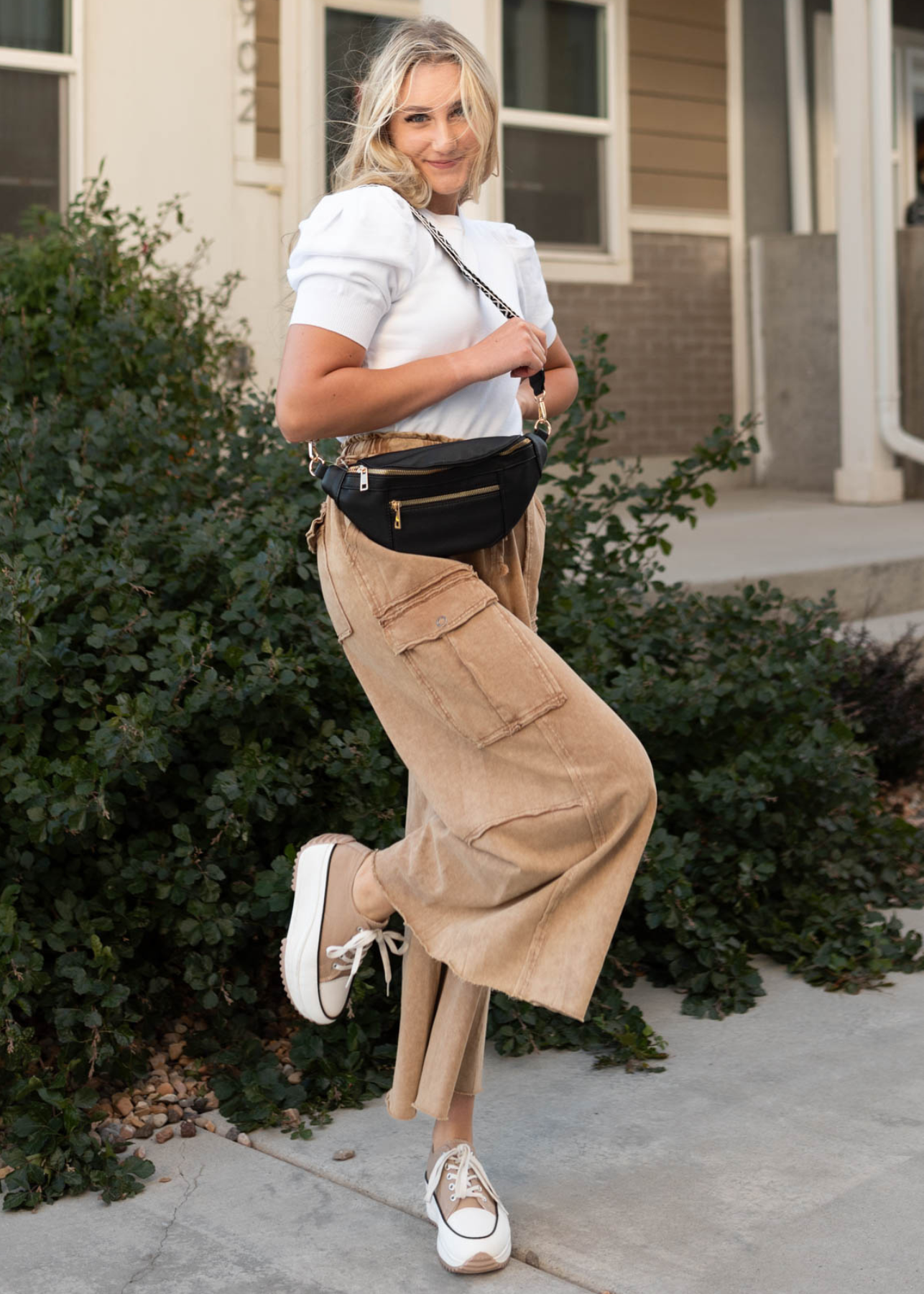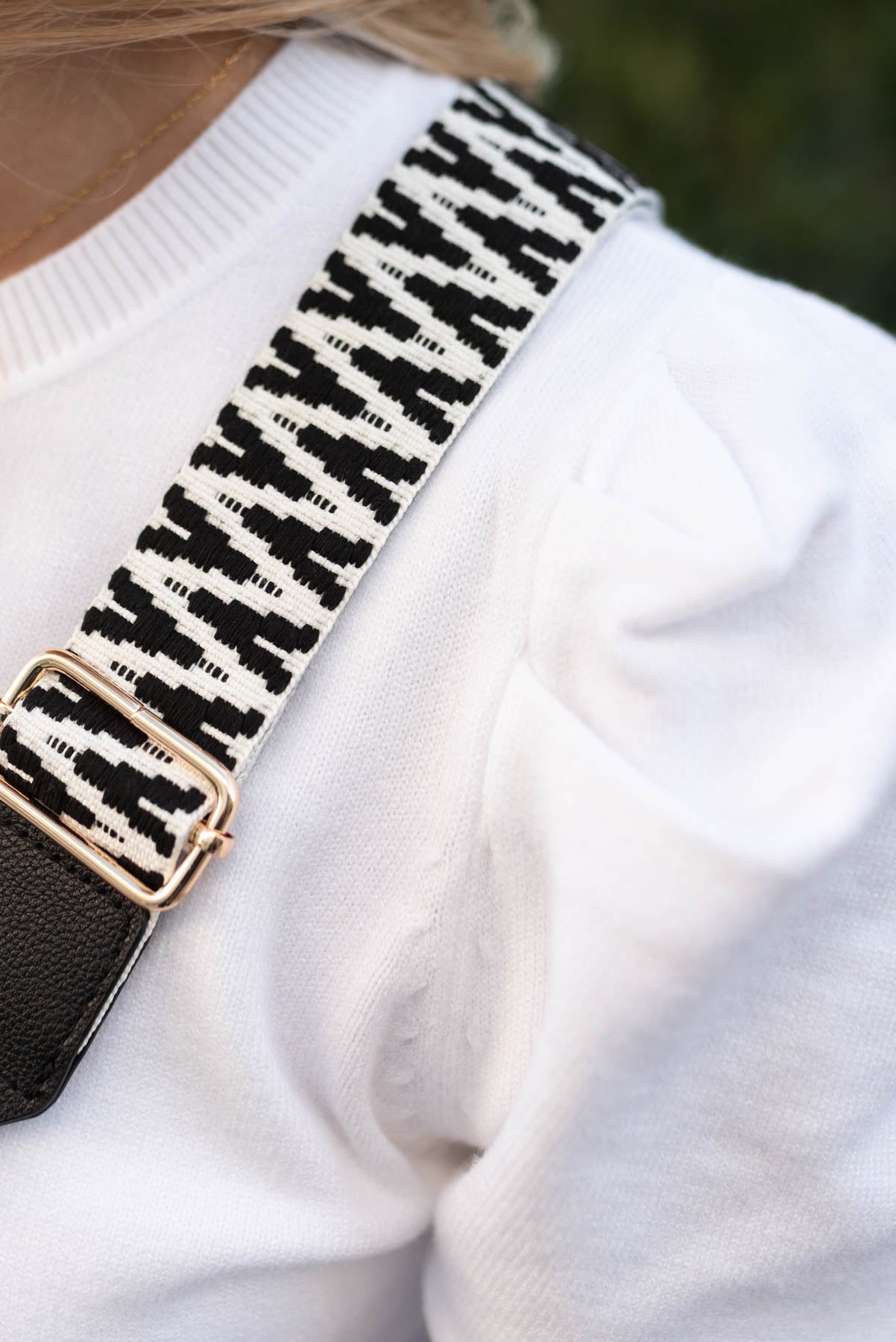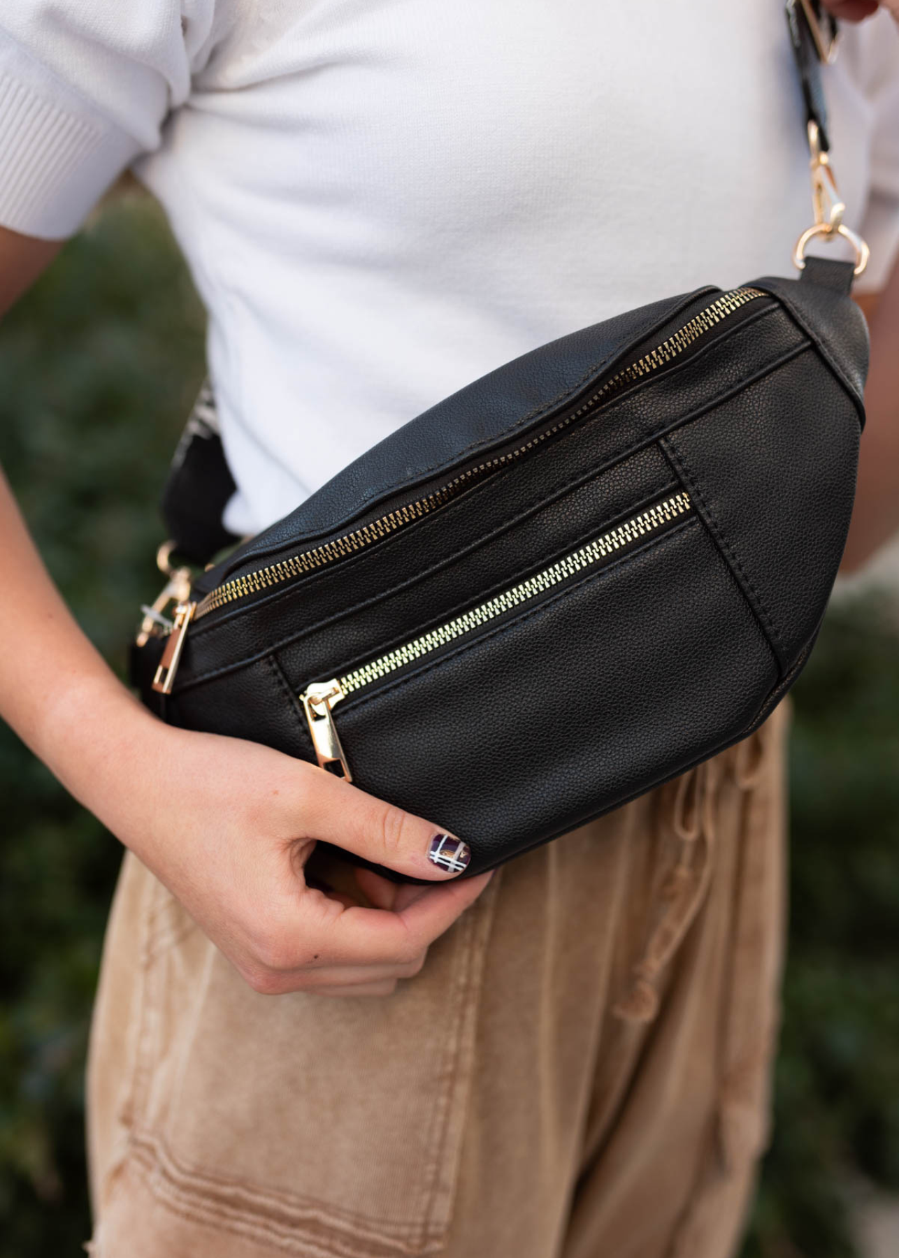 Description: Double front zippers, hidden zipper on the back, main pocket has zipper pocket and open pocket, comes with plain strap and wide woven strap
